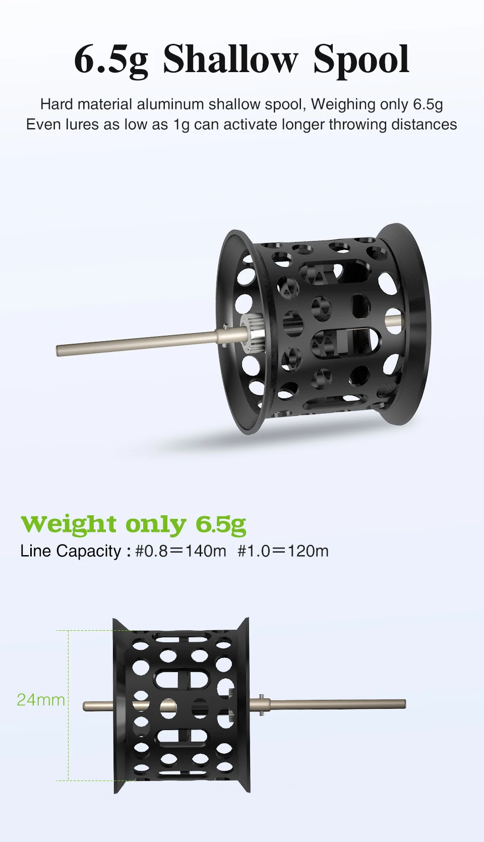 Carrete poco profundo de 6,5 g, incluso los señuelos tan bajos como 1 g pueden activar distancias de lanzamiento más largas