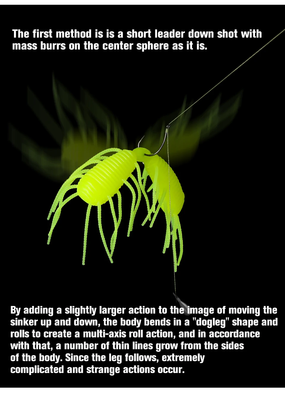 Como enfoque alternativo para los peces que no reaccionan fácilmente, es eficaz una plataforma de clavos con rebabas de trucha colocada en un cuerpo cortado por la mitad. También se puede utilizar como llamado gusano de insectos que se hunde, ya que las piernas del lado del cuerpo emiten finas vibraciones al caer.