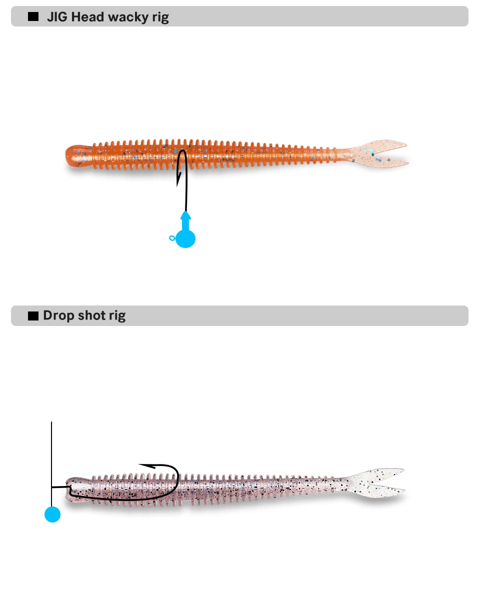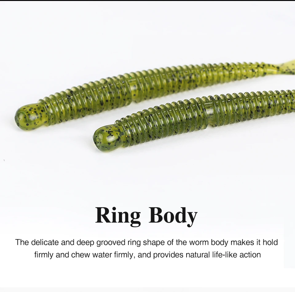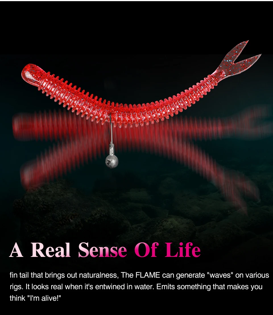 The FLAME is a ringed body, forked fin tail finesse bait. The FLAME is a super buoyant worm with natural squid scent. The FLAME is extremely versatile, Texas rig, drop shot, jig head, wacky and jig trailer are all effective ways to fish this bait. In the middle section of the body, there is a no-ring section that indicates the best position to wacky rig.