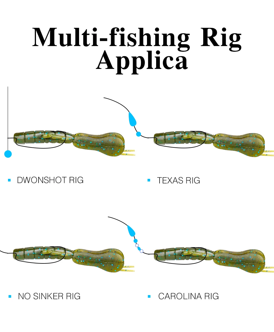 Perfect for a variety of applications as well, the CRAYFISH features a concave back that allows your hook point to remain recessed for perfectly weedless rigging, making it an excellent choice for Texas-rigs, flipping, punching, Carolina-rigs, and even shaky heads.