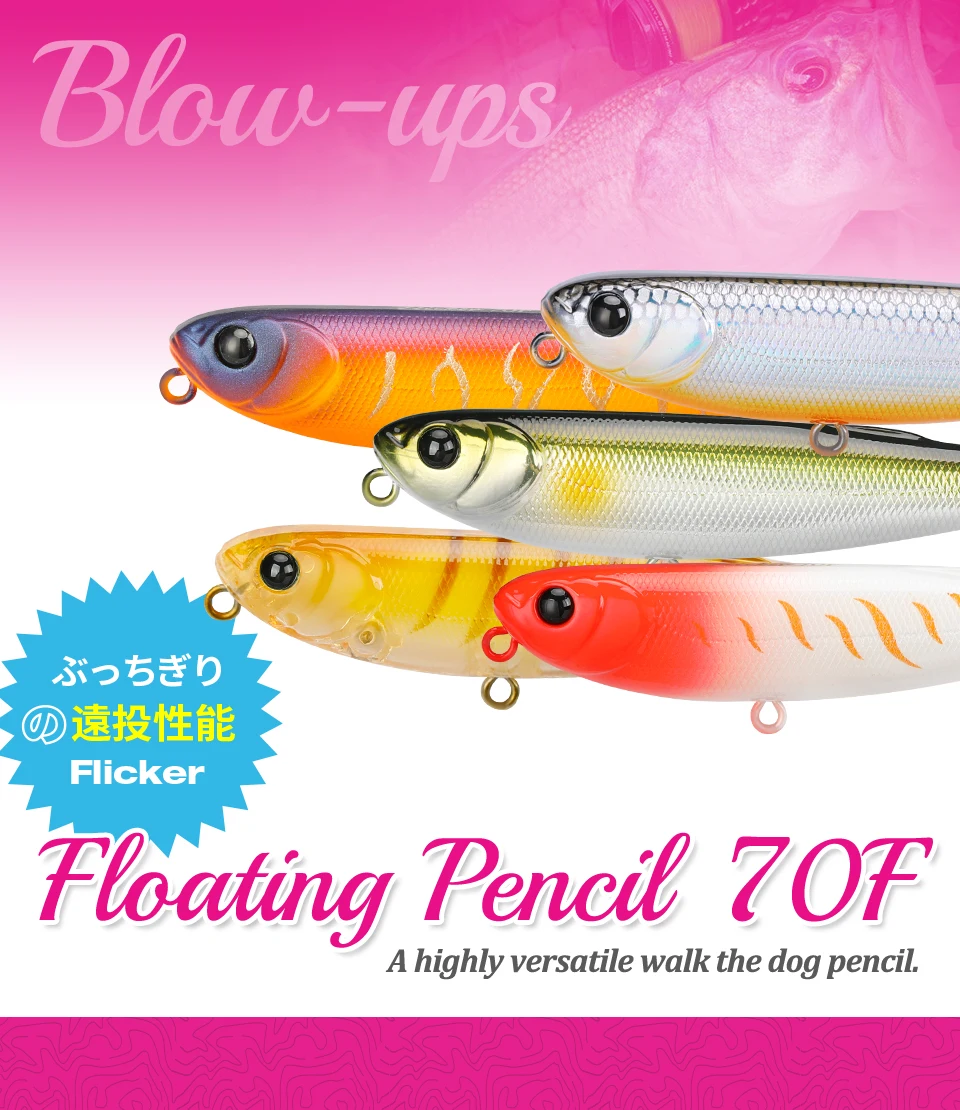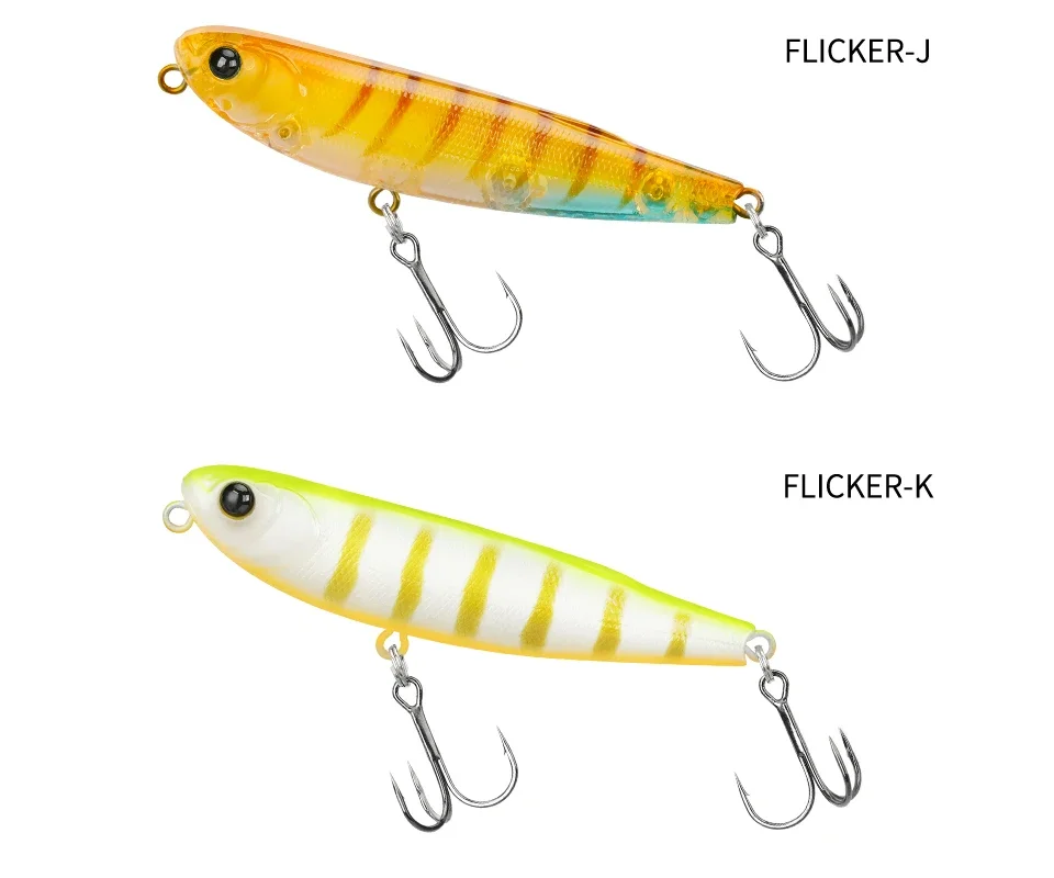 FLICKER, un lápiz de 70 mm, mezcla diapositivas naturales con un ritmo ágil de paseo de perro.Tiene un poder explosivo para juegos de superficie como marabass, dorada y zaman
