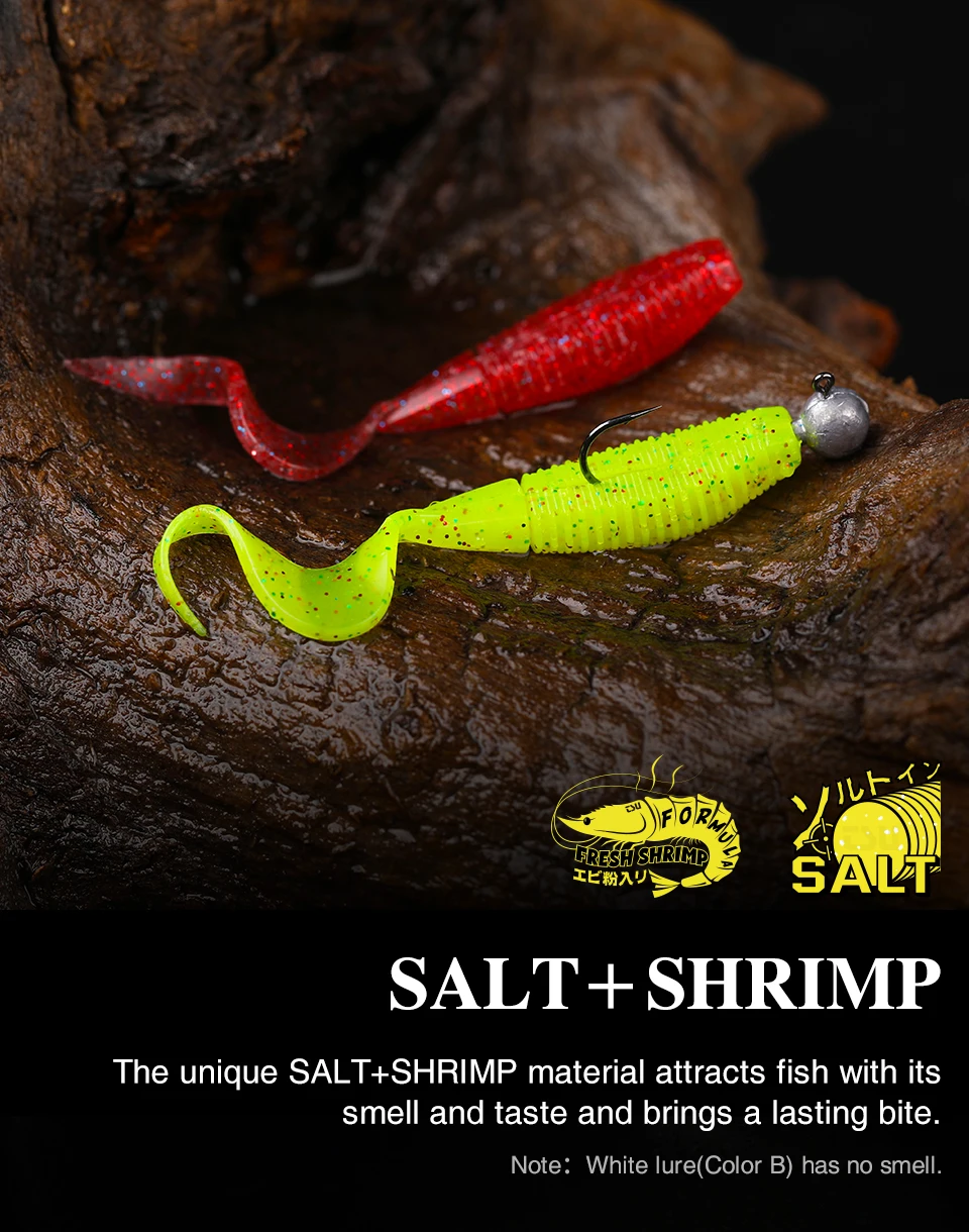 El material único SALT + SHRIMP atrae a los peces con su olor y sabor y aporta un mordisco duradero