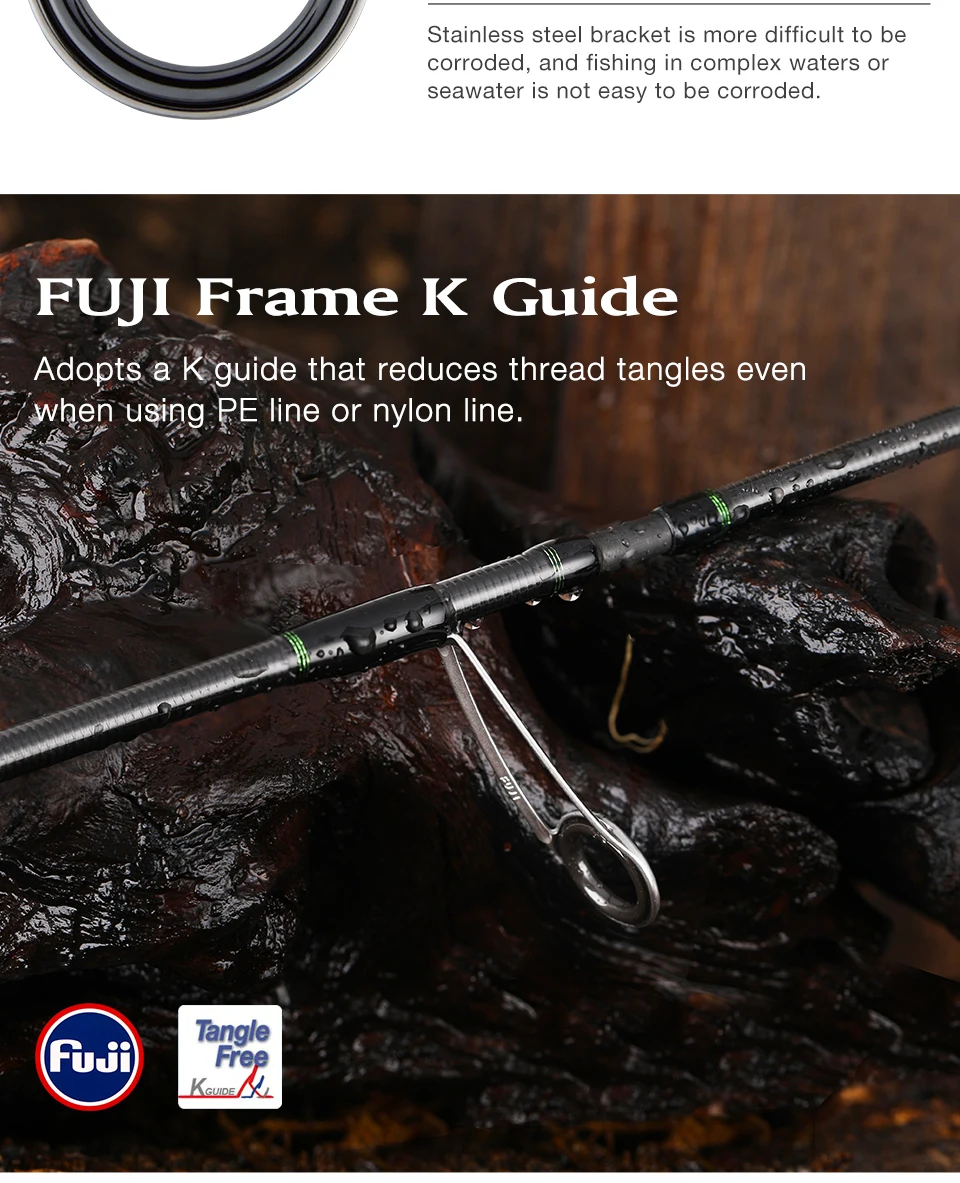 El anillo "O" y la guía "K" de FUJI ayudan a lanzar suavemente por su baja fricción y reducen el enredo de la línea en el marco.