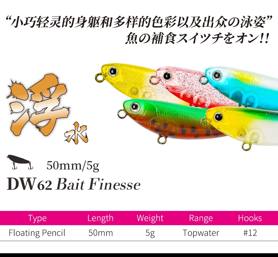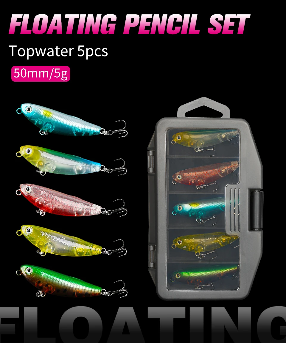 Juego de lápices flotantes TSURINOYA DW62 50mm 5,0G 5 piezas Topwater cebos duros artificiales Trour Pike señuelo de pesca aparejos de pesca de lubina