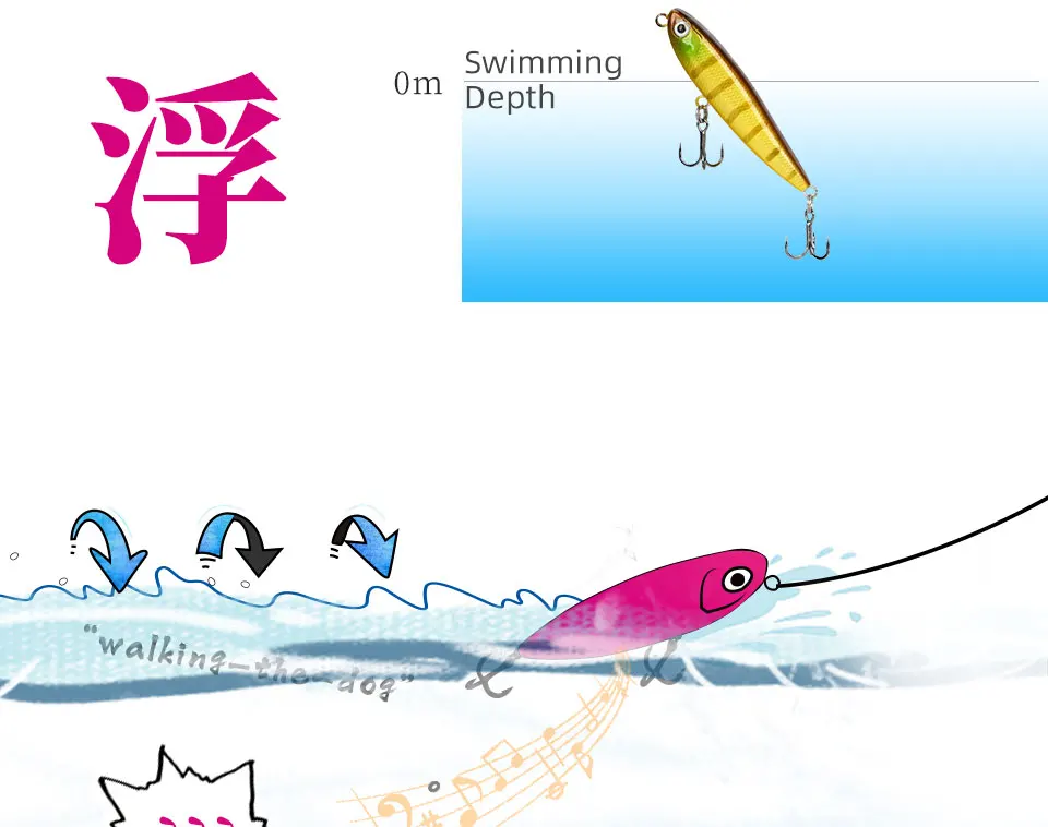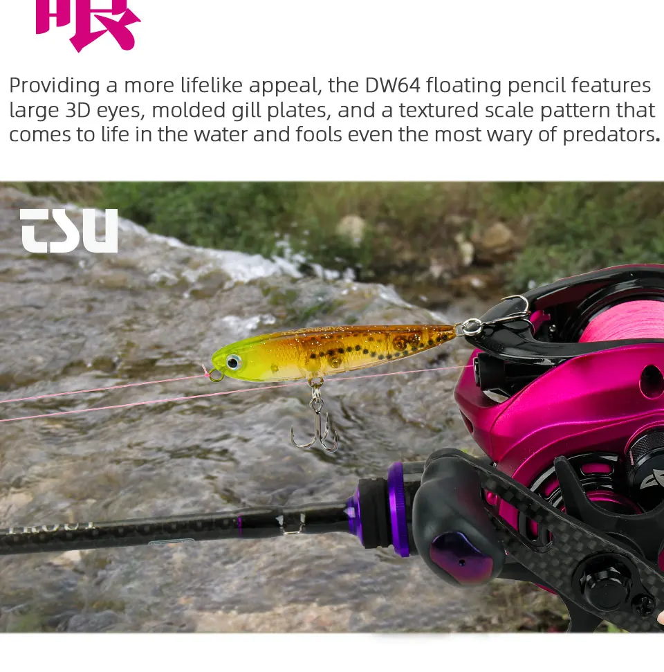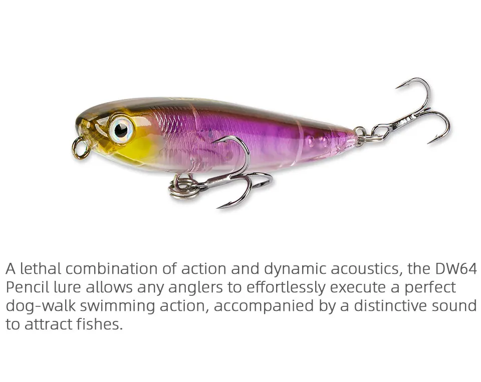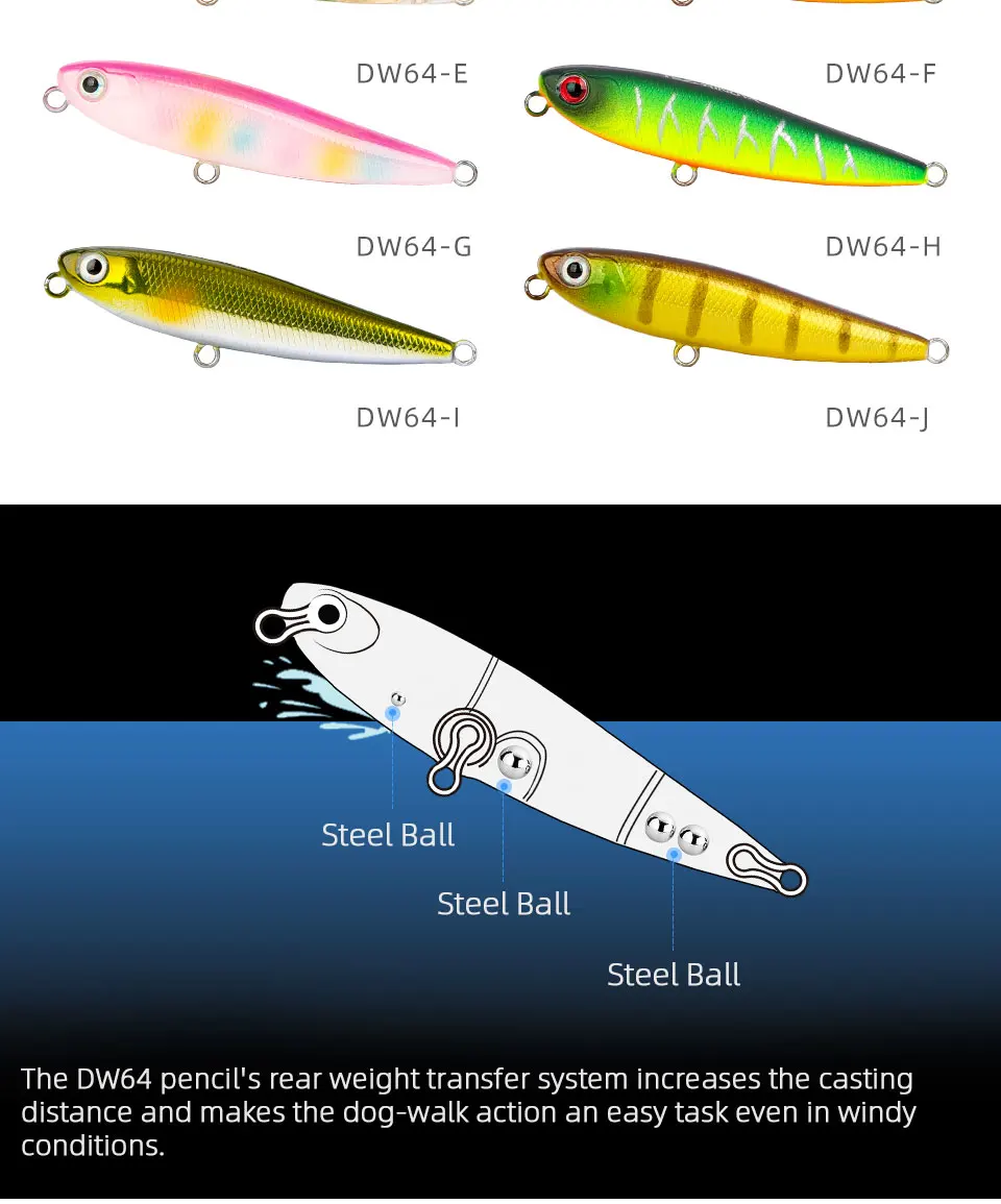 El Sistema de Transferencia de peso trasero aumentó la distancia de lanzamiento, así como una combinación letal de acción y acústica dinámica, el lápiz DW64 permite a cualquier pescador ejecutar sin esfuerzo una acción perfecta de pasear al perro acompañada de un sonajero acústico único.