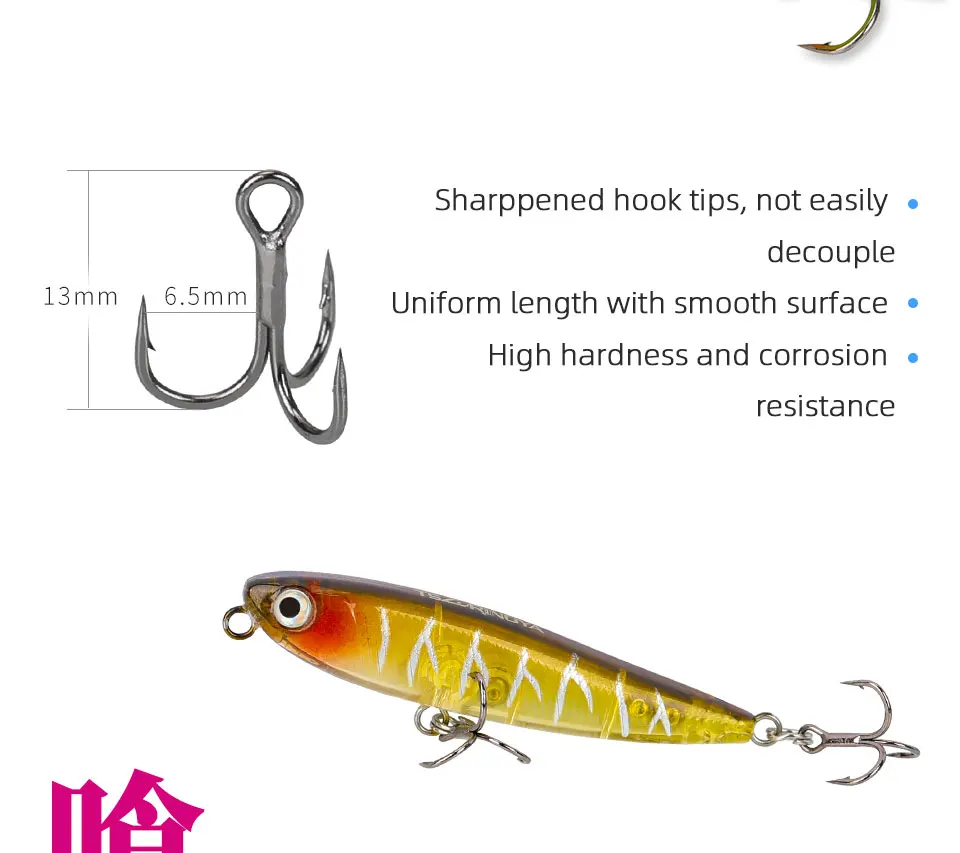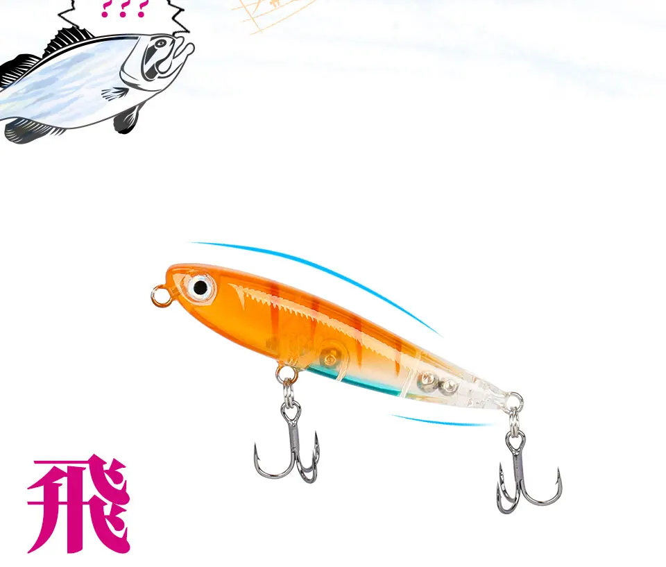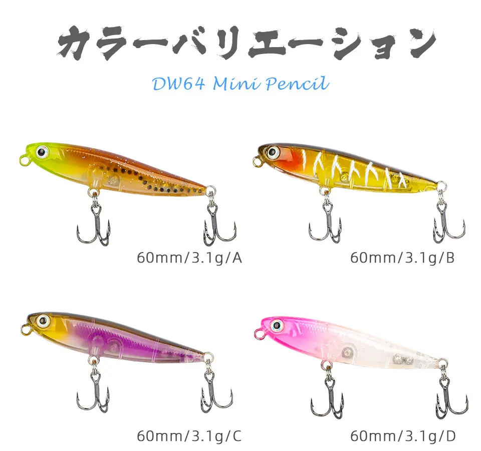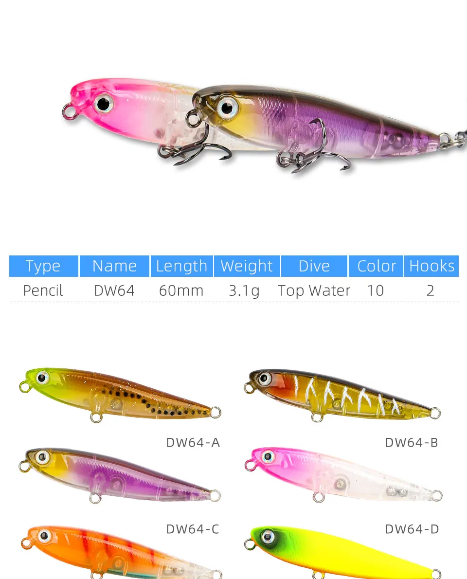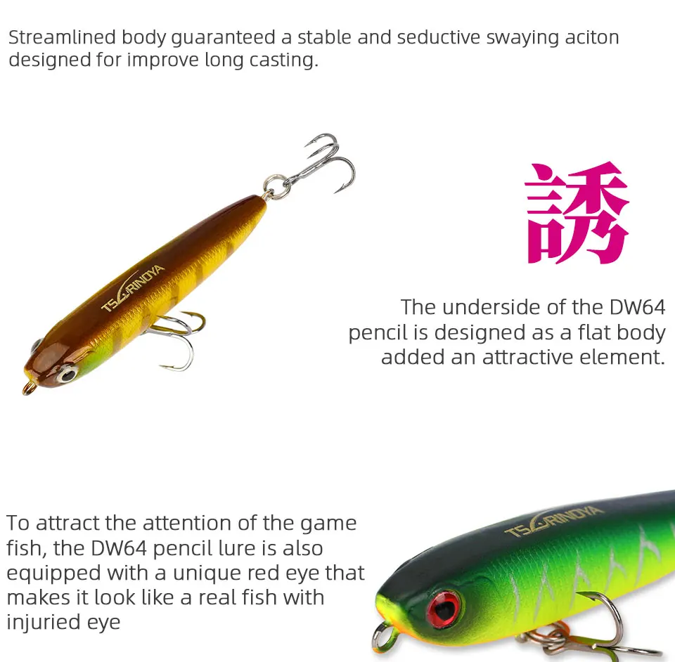 Para ayudar a captar la atención de los peces de caza, el lápiz DW64 también está equipado con ojos rojos distintivos que le dan la apariencia de un pez cebo lesionado.