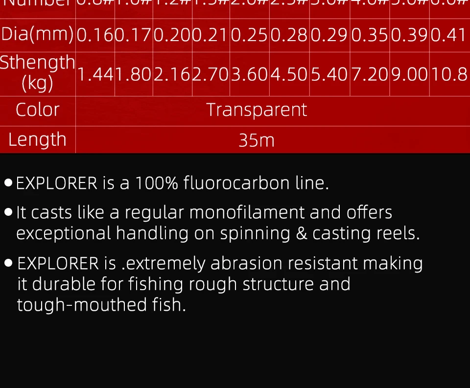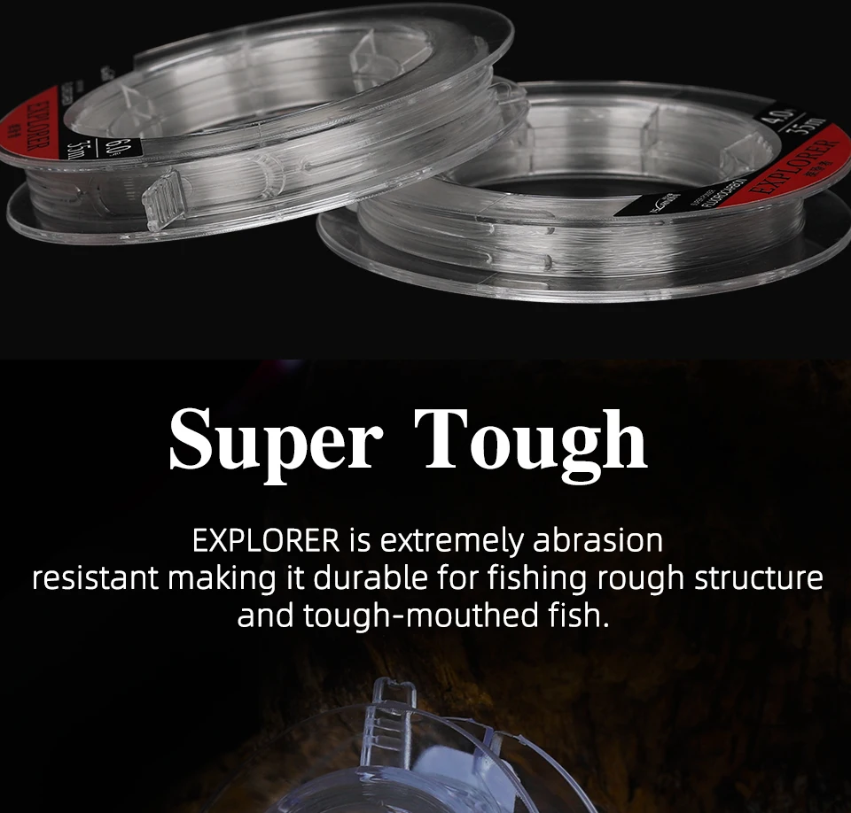 EXPLORER es una línea de fluorocarbono 99% que es prácticamente invisible en el agua y, por lo tanto, ideal para presentaciones sigilosas. Se lanza como un monofilamento regular y ofrece un manejo excepcional en carretes giratorios y de fundición. La línea de fluorocarbono se hunde muchas veces más rápido que las líneas de nylon tradicionales, lo que permite que la presentación se hunda a la zona de impacto más rápido. Su bajo índice de estiramiento mejora el control de la línea, la presentación y la detección de mordidas y optimiza la potencia de ajuste del gancho. EXPLORER es extremadamente resistente a la abrasión, lo que lo hace duradero para pescar estructura áspera y peces de boca dura.
