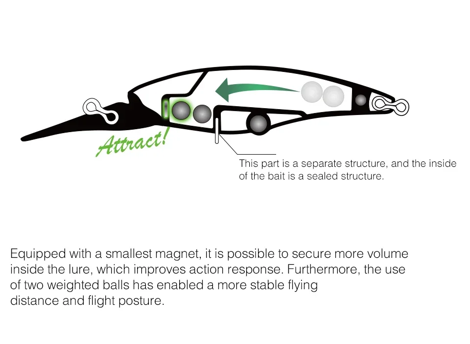 Está equipado con un pequeño magnético.Cuando el señuelo entra en el agua, las bolas de acero se atraen instantáneamente por el imán.El mecanismo de cambio del centro de gravedad lo mantiene en un estado equilibrado y se convierte rápidamente en estado de natación.