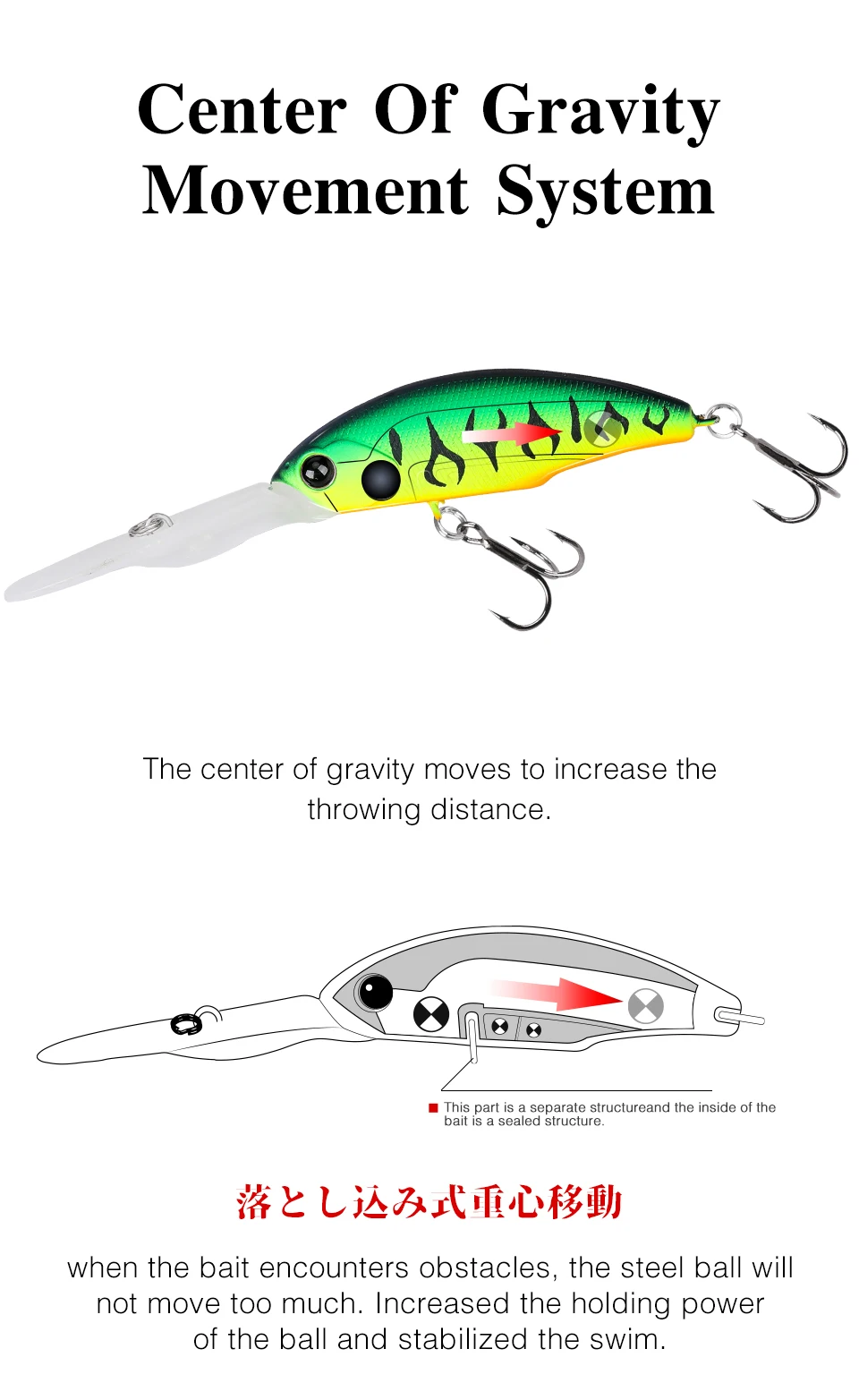 El centro de gravedad se mueve para aumentar la distancia de lanzamiento.Al mismo tiempo, cuando el cebo encuentra obstáculos, la bola de acero no se moverá demasiado.Aumentó el poder de sujeción de la pelota y estabilizó la natación.