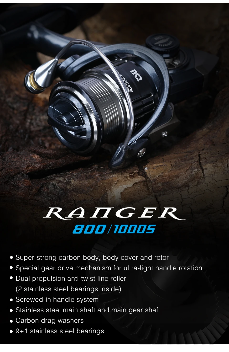 Ranger 1000S: 156 g / 9+1 rodamientos / Relación de transmisión 5,2:1 / Arrastre de 4 kg / MM/M (0.104/100 0,128/70) PE/M (0,4/100 0,6/70)
