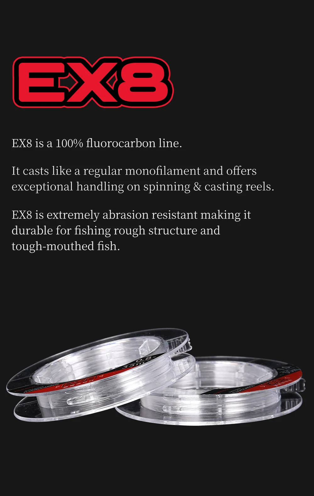 EX8 es una línea 99% de fluorocarbono que es prácticamente invisible en el agua y, por lo tanto, ideal para presentaciones sigilosas.