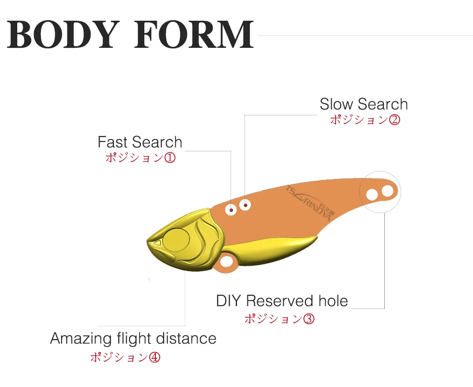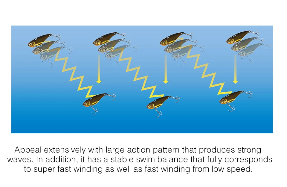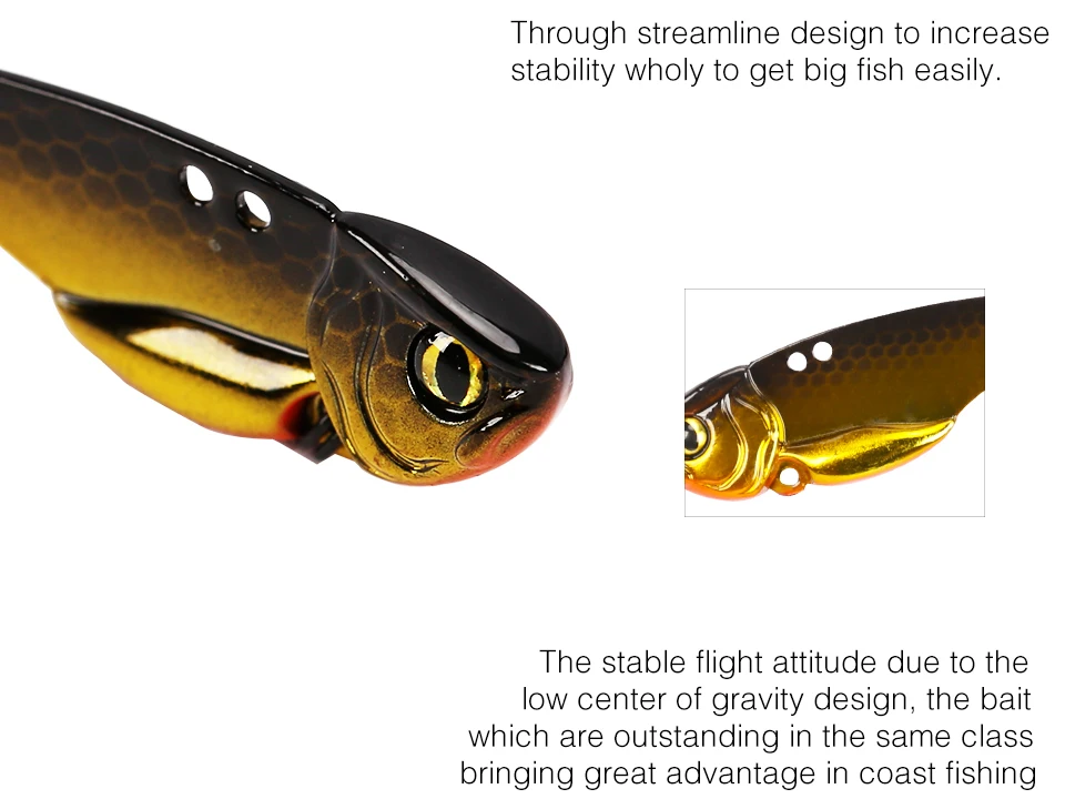 La actitud estable del vuelo debido al diseño bajo del centro de gravedad, realiza el movimiento del oscilación lateral abdominal, el cebo que es excepcional en la misma clase, lo que trae una gran ventaja en la pesca de costa.