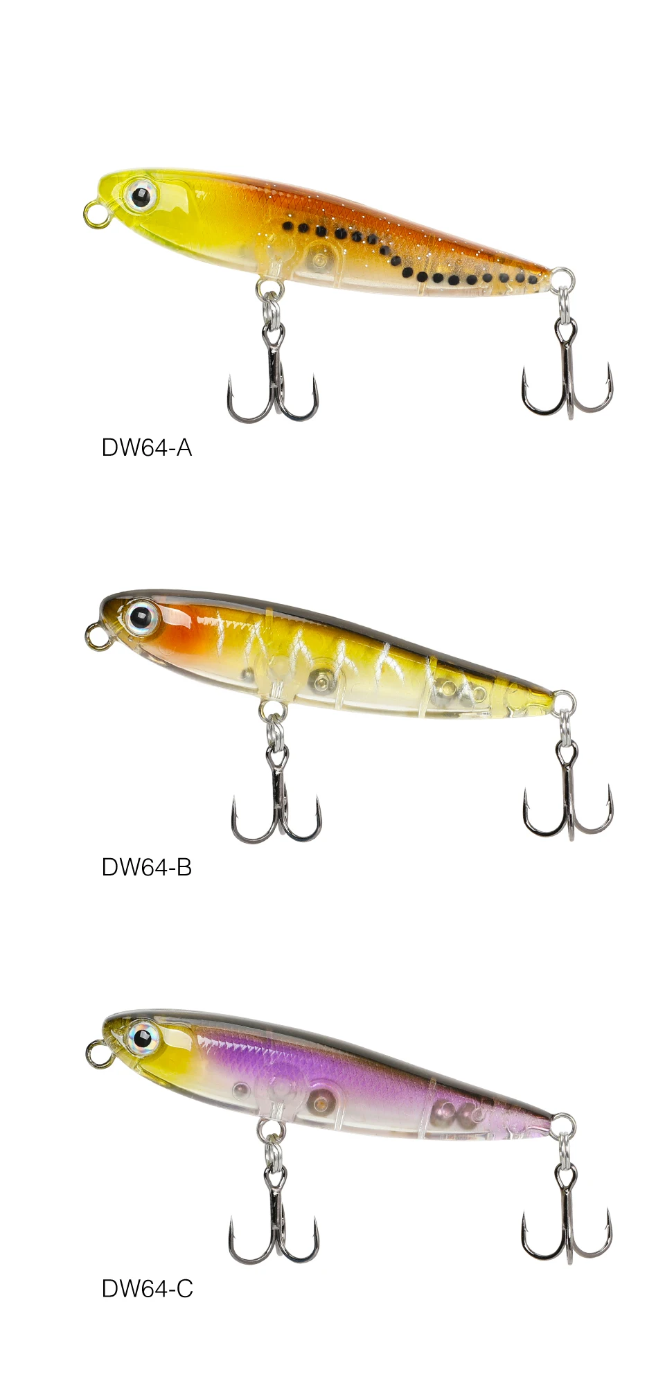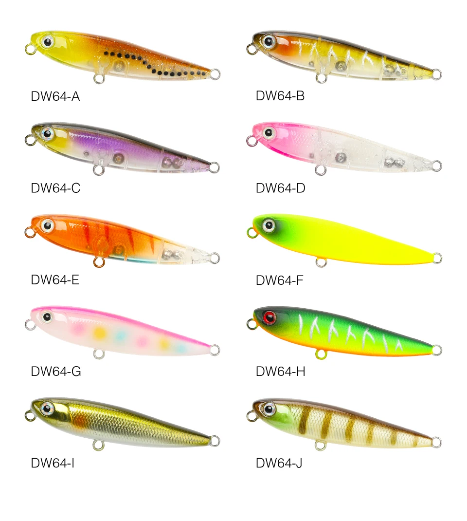 El Sistema de Transferencia de peso trasero aumentó la distancia de lanzamiento, así como una combinación letal de acción y acústica dinámica, el lápiz DW64 permite a cualquier pescador ejecutar sin esfuerzo una acción perfecta de pasear al perro acompañada de un sonajero acústico único.