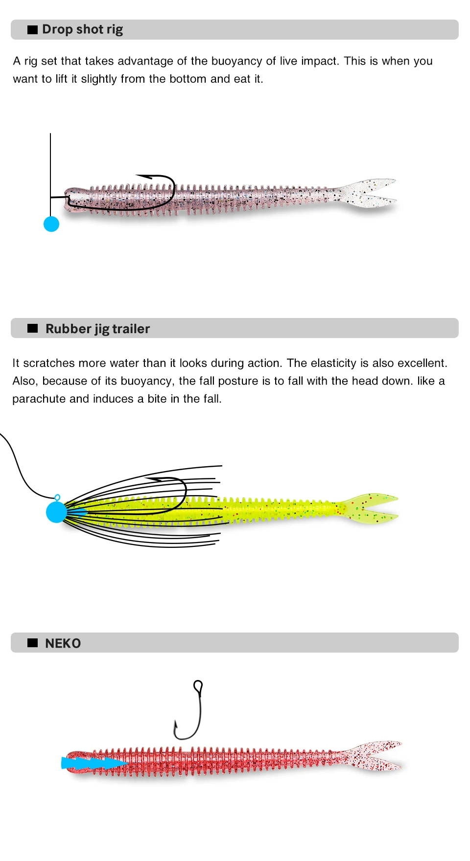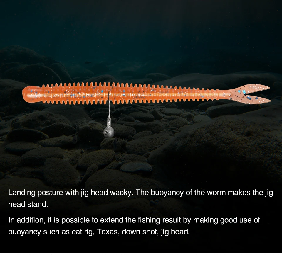 Postura de aterrizaje con cabeza de anzuelo loco. La flotabilidad del gusano hace que la cabeza de la plantilla esté en pie. Además, es posible extender el resultado de la pesca haciendo un buen uso de la flotabilidad como el aparejo para gatos, Texas, el tiro abajo, la cabeza de anzuelo.
