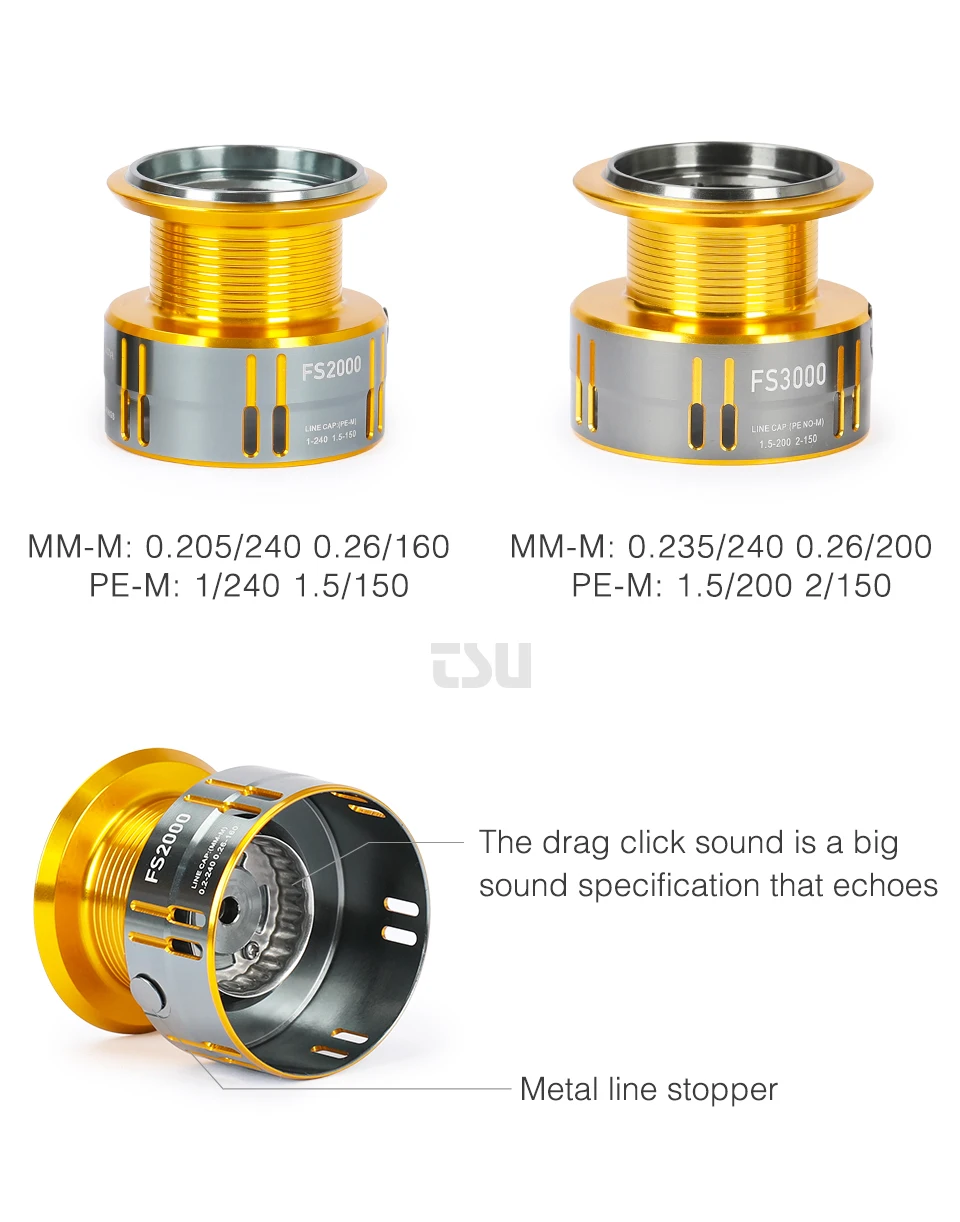 2.FS3000| Peso: 263 g| Relación de engranajes: 5,2:1| Rodamiento: 9+1BB| Arrastre máximo: 7KG| Capacidad de línea (mm-M): 0,235/240 0,26/200