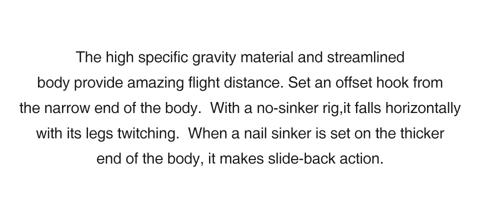 Coloque un gancho de compensación desde el extremo estrecho del cuerpo. Con una plataforma sin plomo, cae horizontalmente con sus patas temblando. Cuando una plomada de uñas se coloca en el extremo más grueso del cuerpo, hace una acción deslizante hacia atrás.