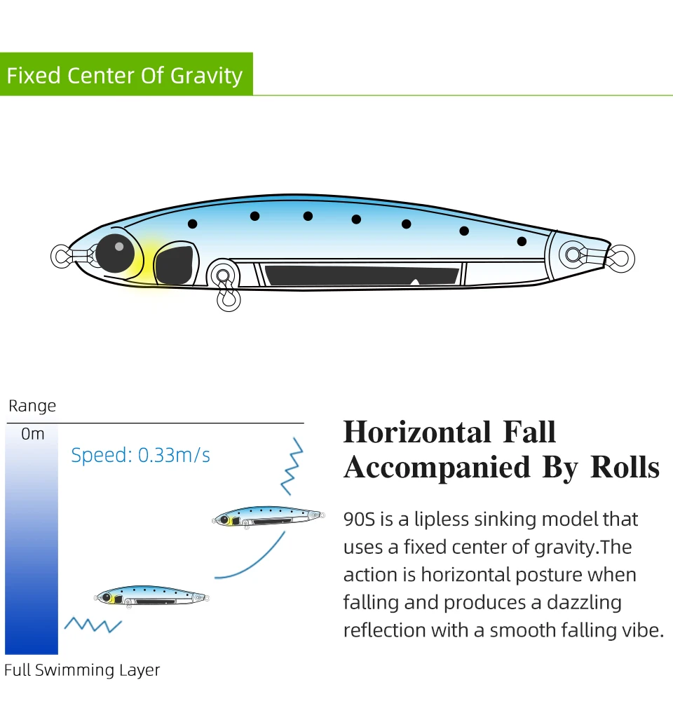 1. 90S is a lipless sinking model that uses a fixed center of gravity. Extremely low air resistance and long-distance casting enable stress-free fishing even in lakes that require long distances. It has a good flight attitude and flies straight, so it has excellent accuracy performanc