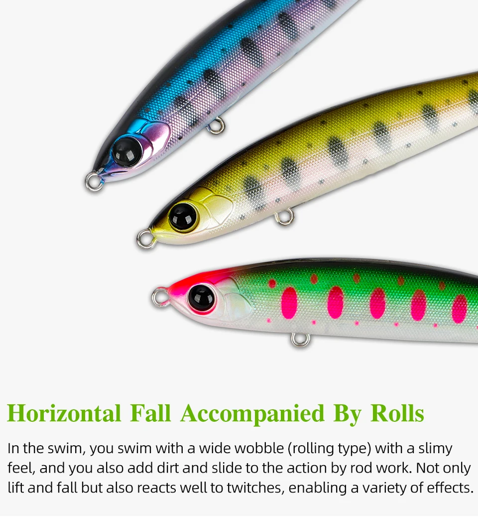 2. The action is horizontal posture when falling and produces a dazzling reflection with a smooth falling vibe. In the swim, you swim with a wide wobble (rolling type) with a slimy feel, and you also add dirt and slide to the action by rod work. Not only lift and fall but also reacts well to twitches, enabling a variety of effects.
