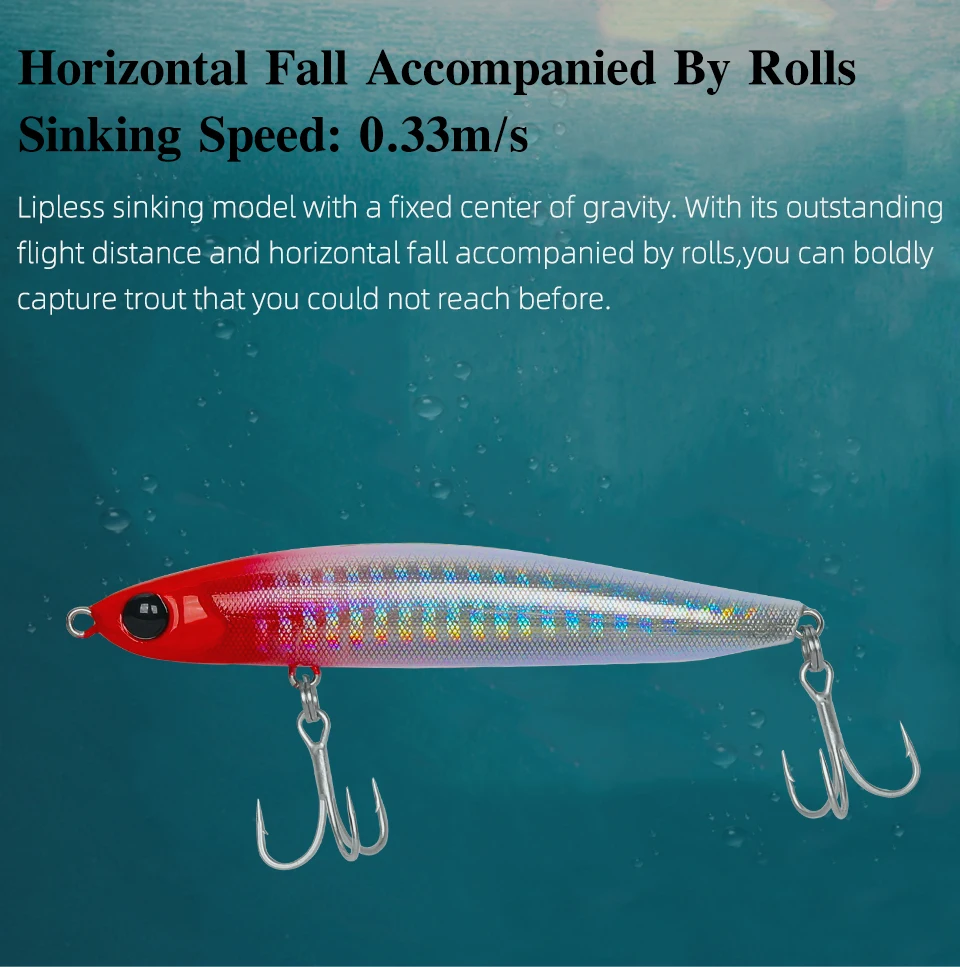 4. Lipless sinking model with a fixed center of gravity. With its outstanding flight distance and horizontal fall accompanied by rolls, you can boldly capture trout that you could not reach before.