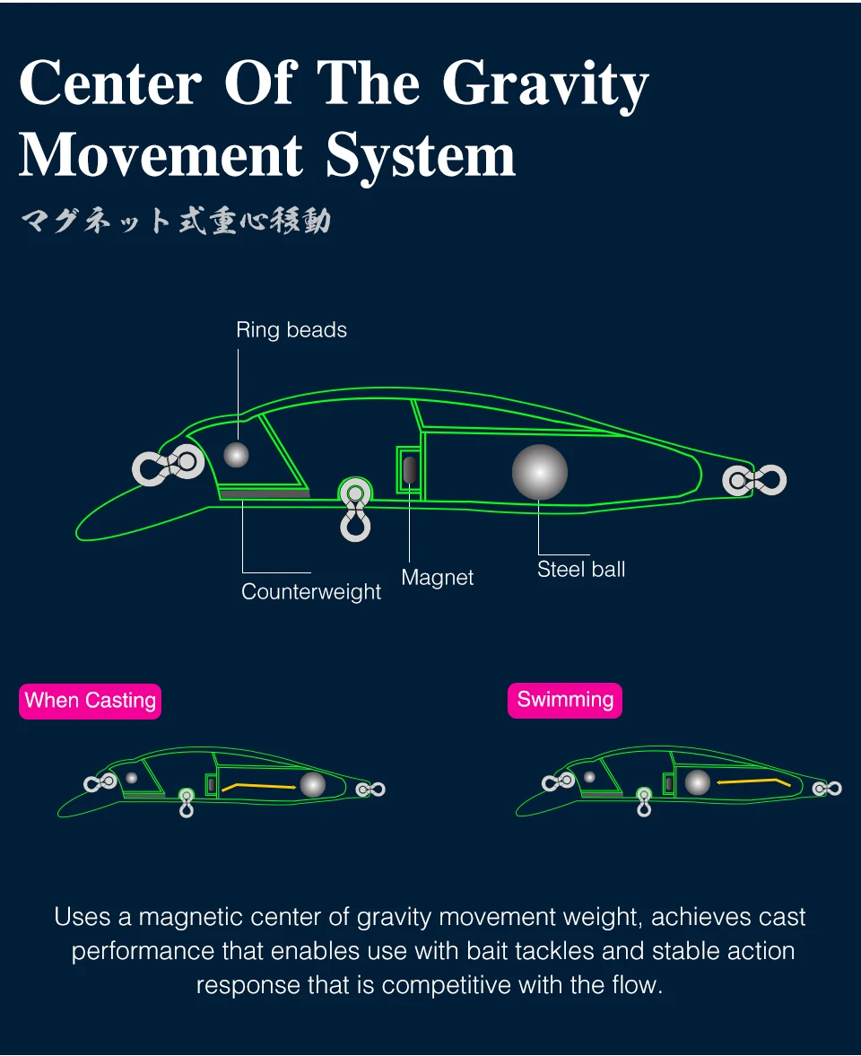 1. El cuerpo ha sido equipado con un sistema de peso móvil de separación de imanes para una sujeción absoluta para los pescadores de tierra para sacar su señuelo en fuertes vientos de cabeza y vientos laterales.