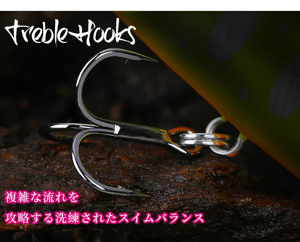 El labio semilargo para sujetar el agua y el cuerpo del lado plano con bajo centro de gravedad ajustes de peso fijo han equipado el señuelo con un alto nivel de rendimiento de natación en el fuerte flujo del principal corriente