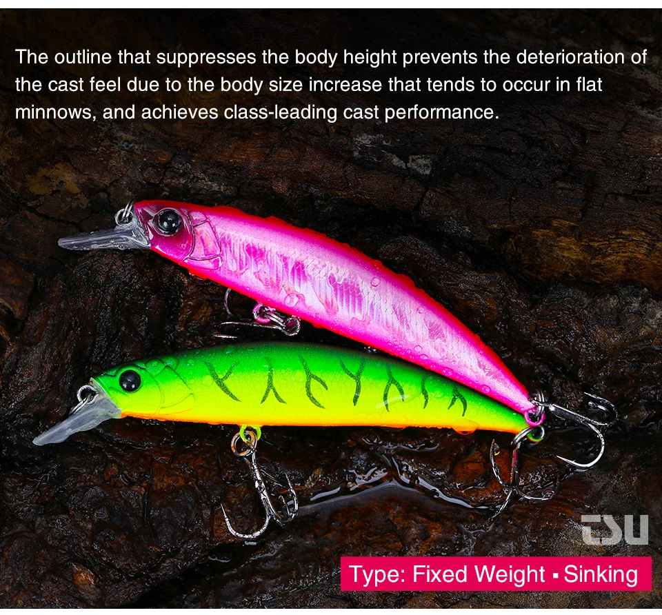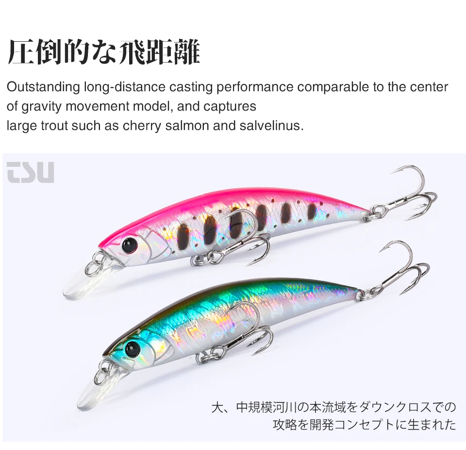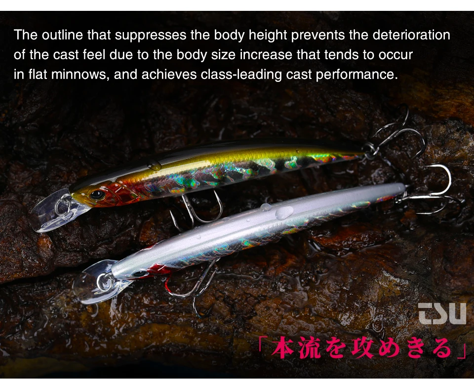 El labio semilargo para sujetar el agua y el cuerpo del lado plano con bajo centro de gravedad ajustes de peso fijo han equipado el señuelo con un alto nivel de rendimiento de natación en el fuerte flujo del principal corriente Su Iniciación de acción es inmediata y puede manejar contracción continua a través del trabajo de la varilla.