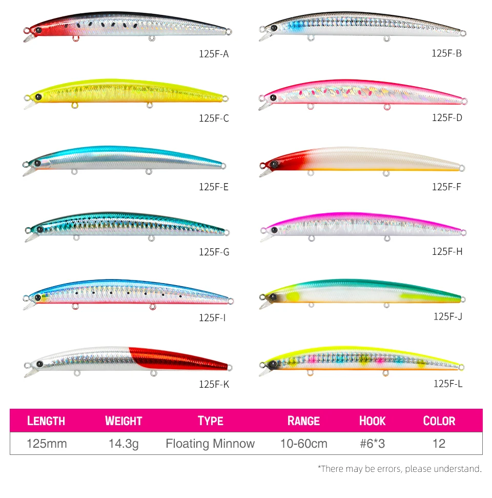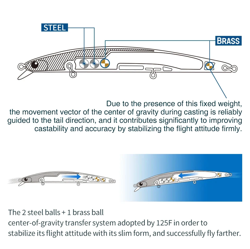 -Long Casting Slim Minnow, 125F logra un vuelo estable incluso en condiciones adversas debido al equilibrio de peso reajustado.