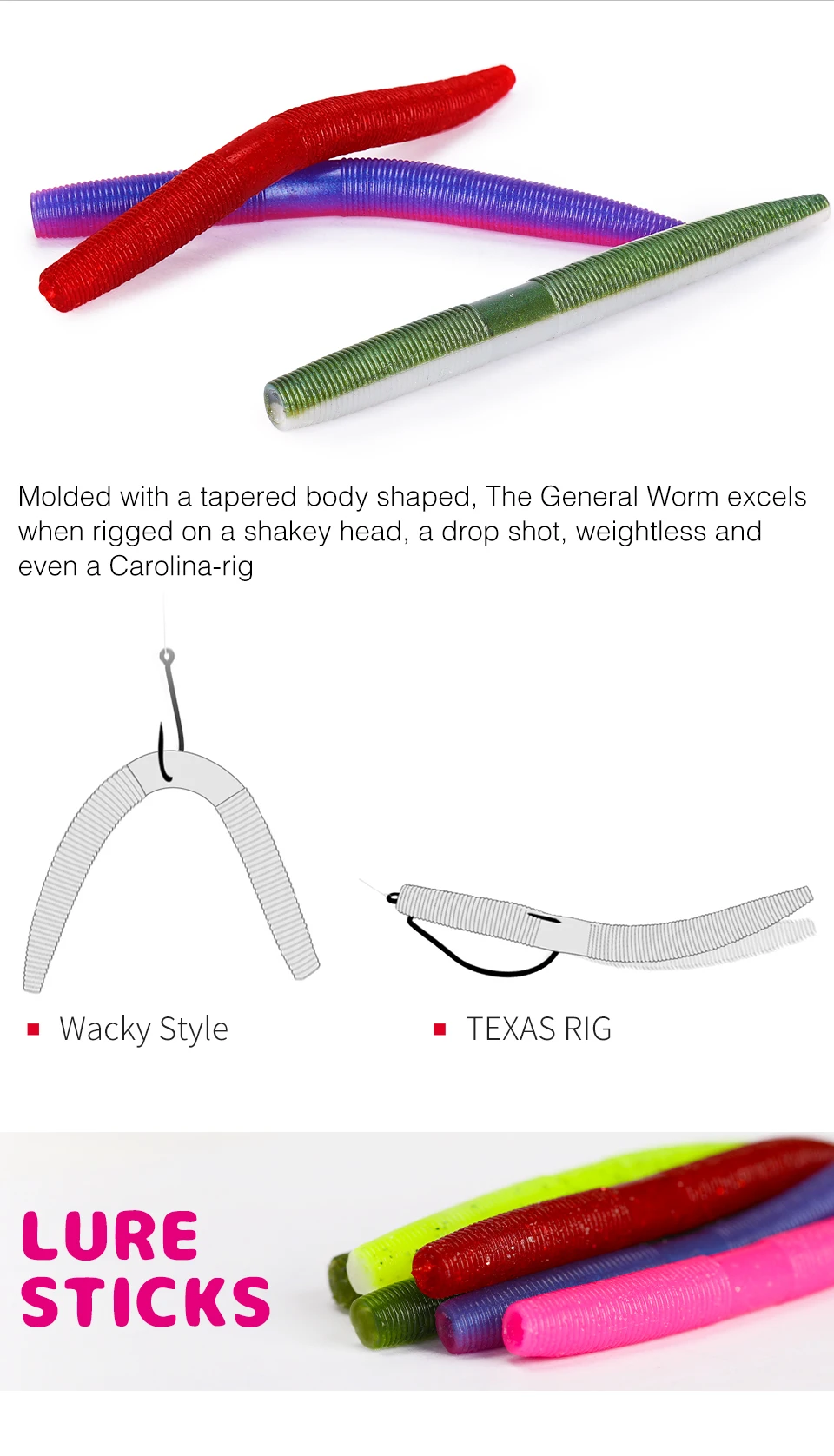 4. Moldeado con un cuerpo cónico en forma, el gusano General sobresale cuando está aparejado en una cabeza de shakey, una gota, sin peso e incluso un Carolina-rig.