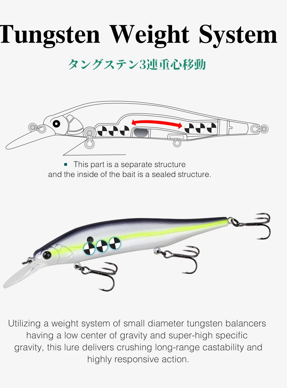 5. Utilizando un sistema de pesas de equilibradores de tungsteno de diámetro pequeño con un centro de gravedad bajo y una gravedad específica superalta, este señuelo ofrece trituración de larga capacidad de giro y una acción altamente sensible