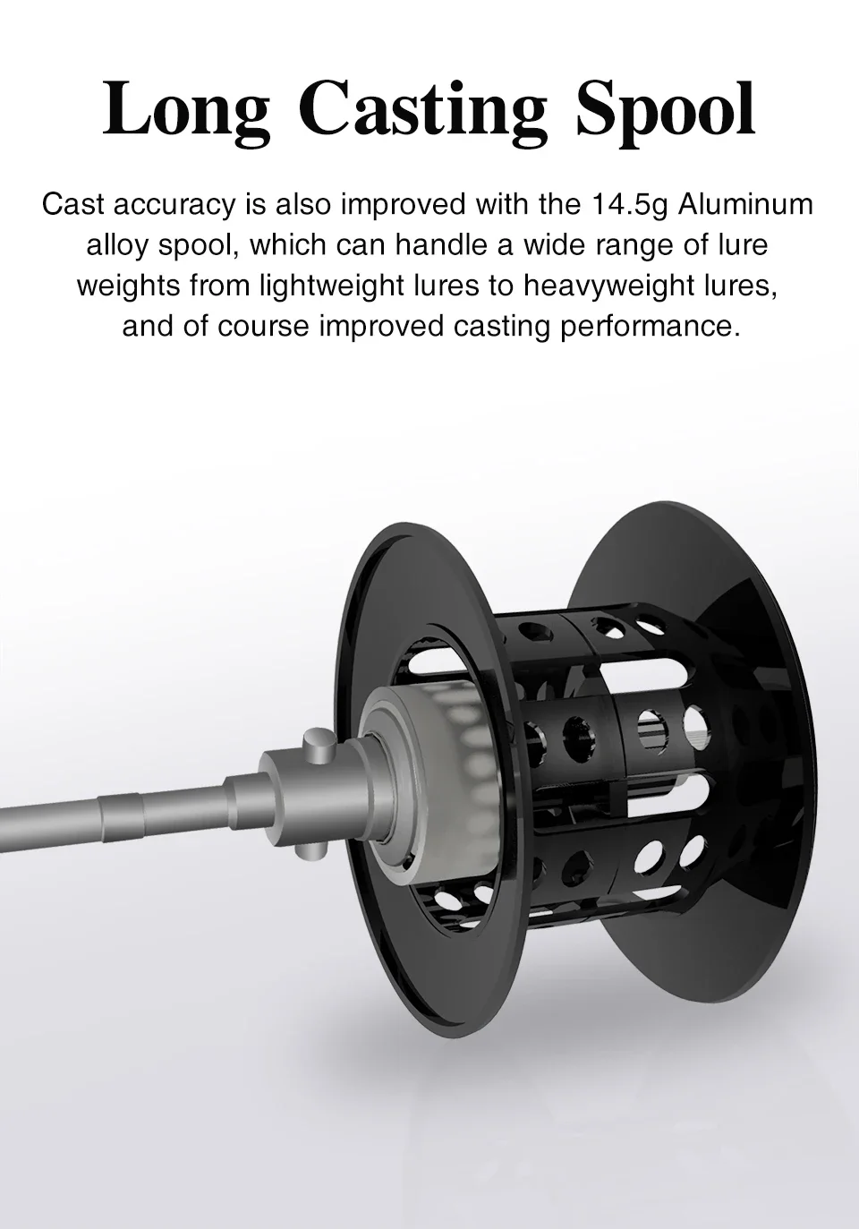 La precisión del lanzamiento también se mejora con el carrete de aleación de aluminio de 14,5 g, que puede soportar una amplia gama de pesos de señuelos, desde señuelos livianos hasta señuelos pesados, y, por supuesto, mejorar el rendimiento del lanzamiento.