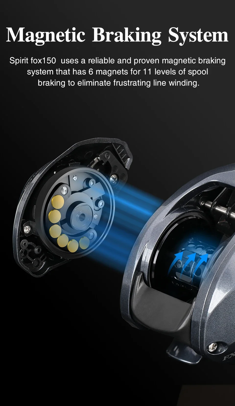 FX150 utiliza un sistema de frenado magnético confiable y probado que tiene 6 imanes para 11 niveles de frenado del carrete para eliminar el frustrante bobinado de la línea.