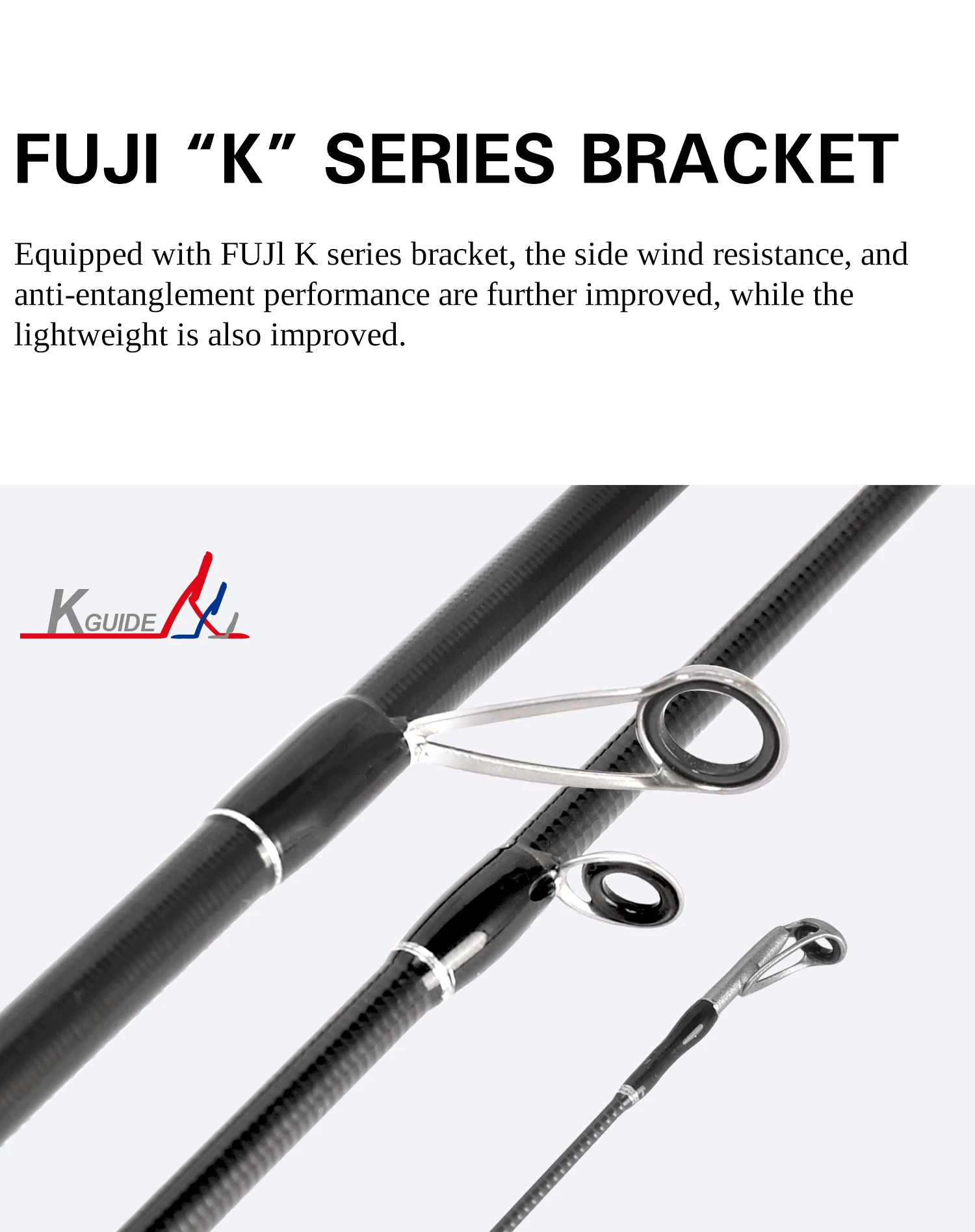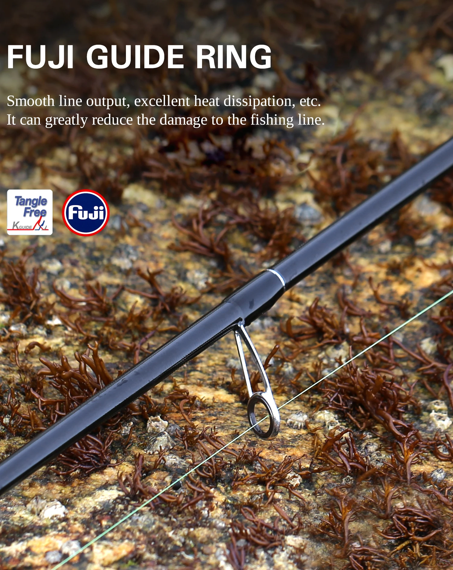 La varilla tiene un aspecto limpio, sencillo y, por tanto, elegante. Tiene una funda de alta calidad fabricada en neopreno grueso. El portacarretes es el punto fuerte de este modelo. Sujeta el carrete de forma segura. La caña es rápida y afilada. Sin embargo, hay algunas características que impactan negativamente la sensación general de este diseño: • mal equilibrio de la caña porque está muy pesada hacia adelante • primera guía muy pequeña, probablemente talla 12. Por lo tanto, necesitas un carrete muy pequeño debido al tamaño del primer anillo. Pero hay que pesar mucho para mejorar el equilibrio de esta caña. No tengo un carrete así.