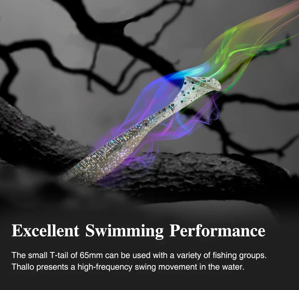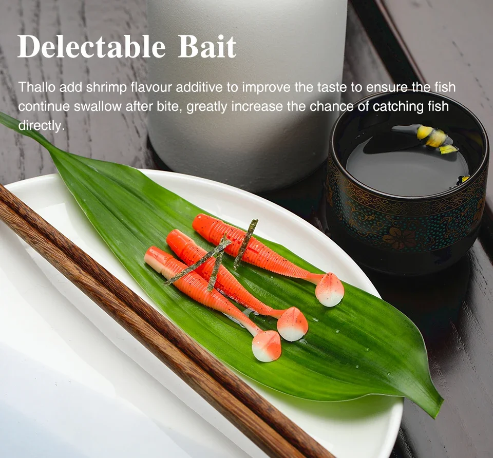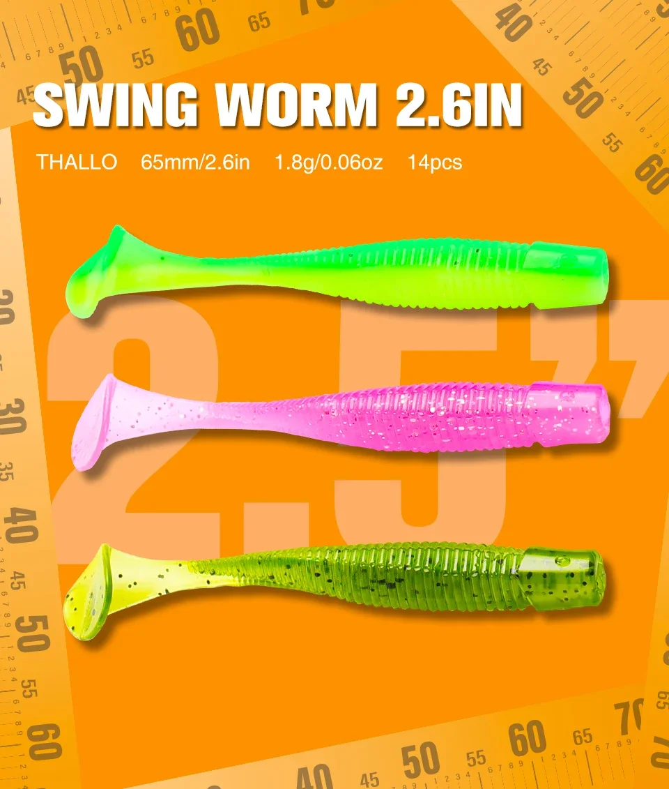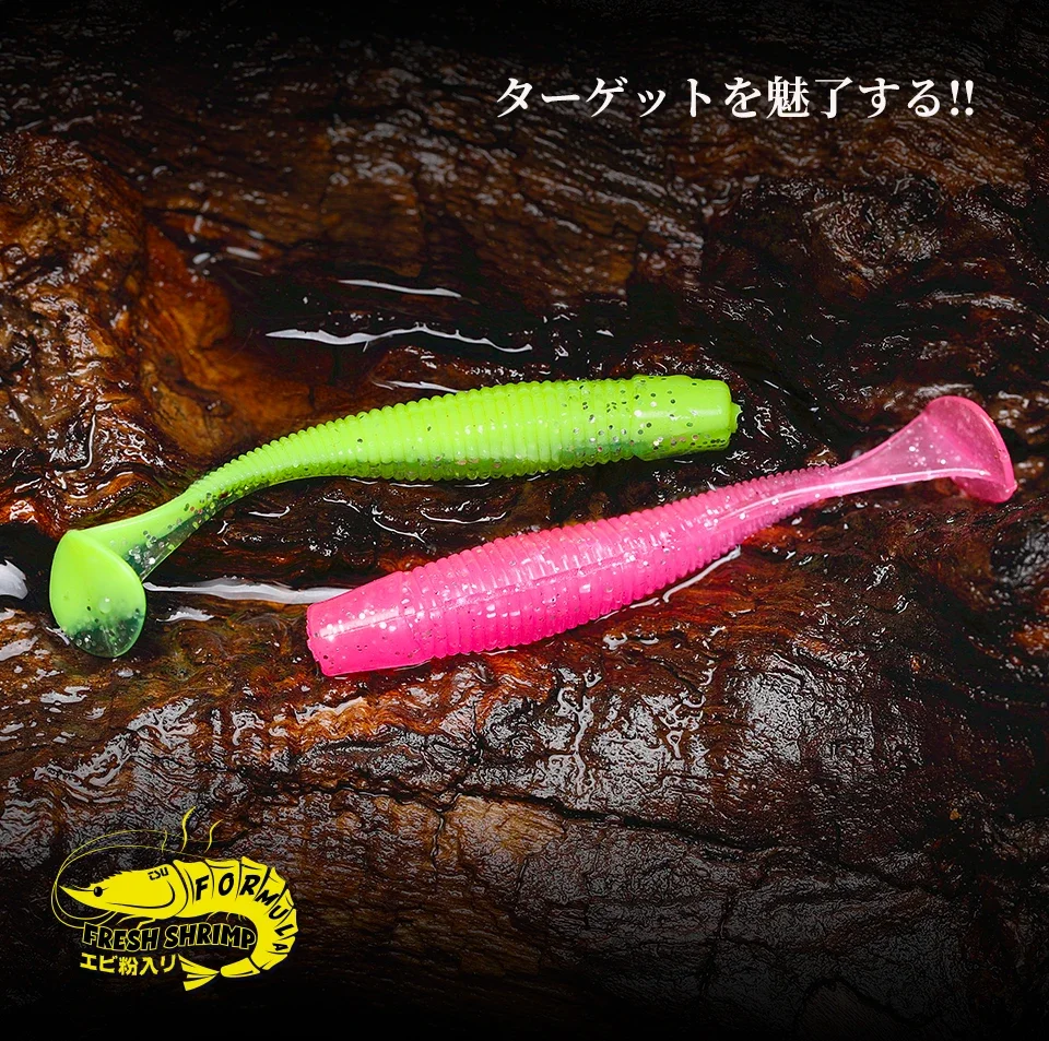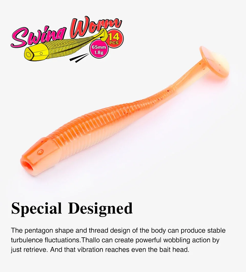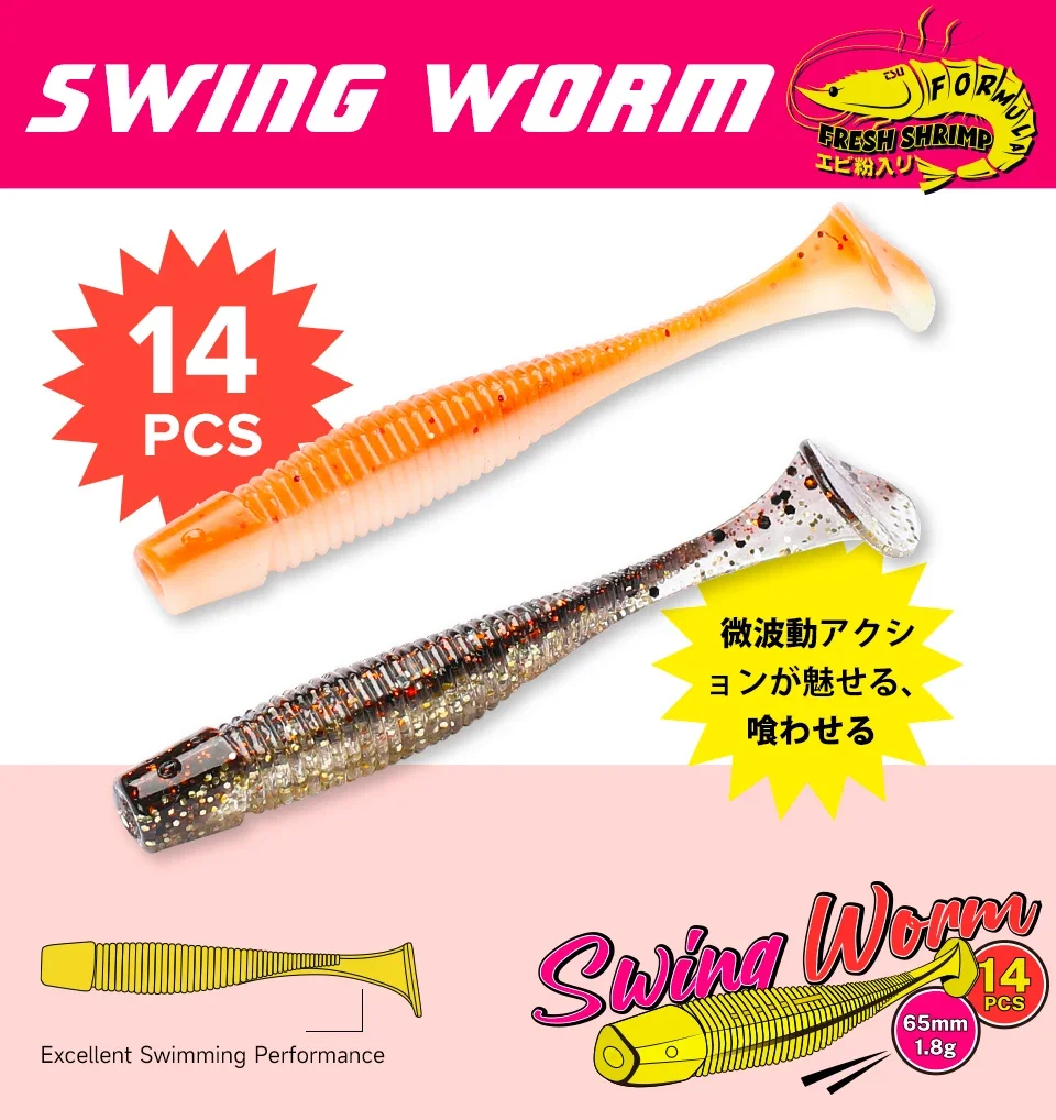 TSURINOYA T cola columpio gusano cebo suave THALLO 65mm 1,8g 14 Uds agregar sabor a camarón cebos de pescado falso lubina aparejos de pesca Wormbait