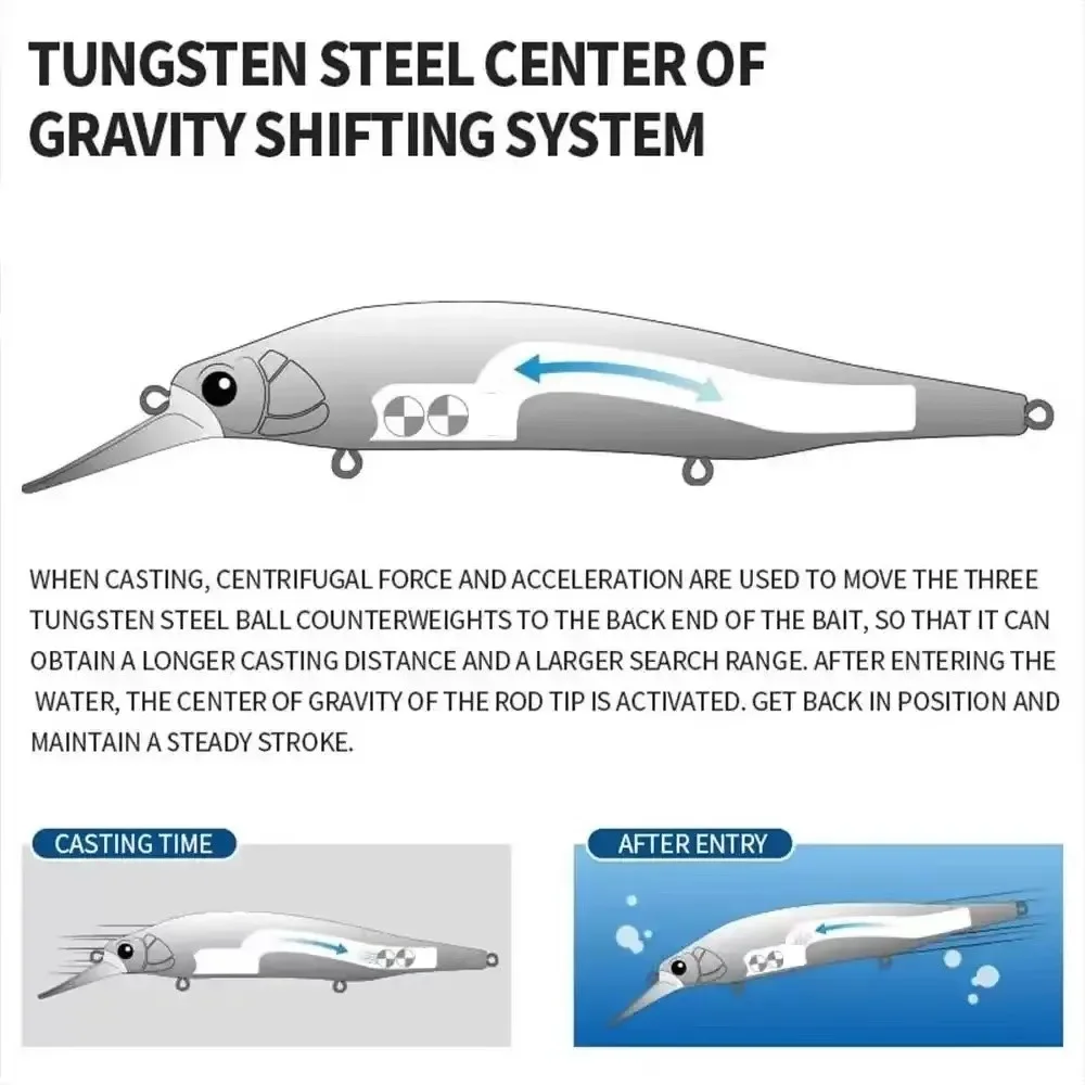 Alinear el labio a lo largo del eje central del cuerpo y el cuerpo plano corta la resistencia al flujo de agua que interfiere con el cuerpo durante el tirón para suprimir la disminución de la distancia de movimiento, el tamaño de salida y la acción de dardo errática.