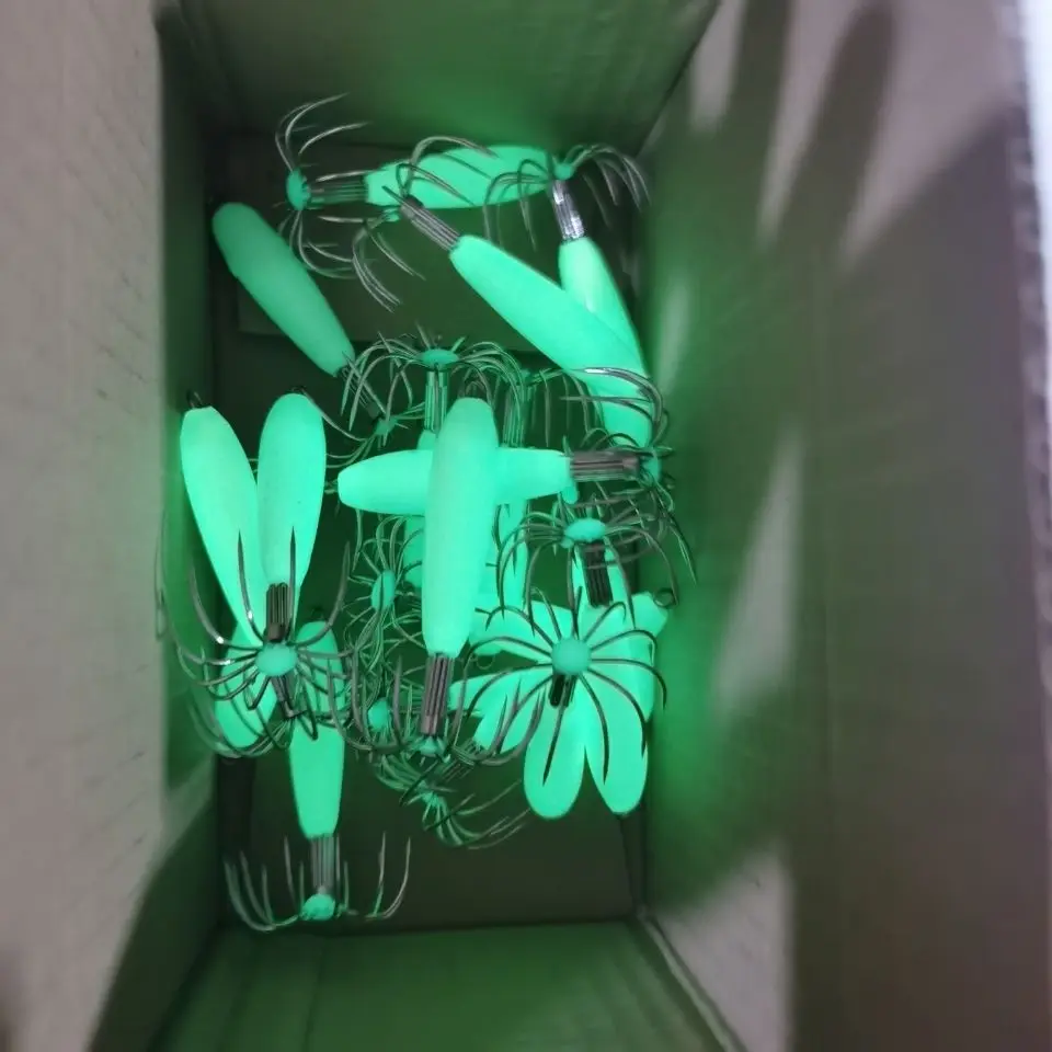 Cebo de calamar verde claro de noche, material brillante, brillará después de absorber la luz.