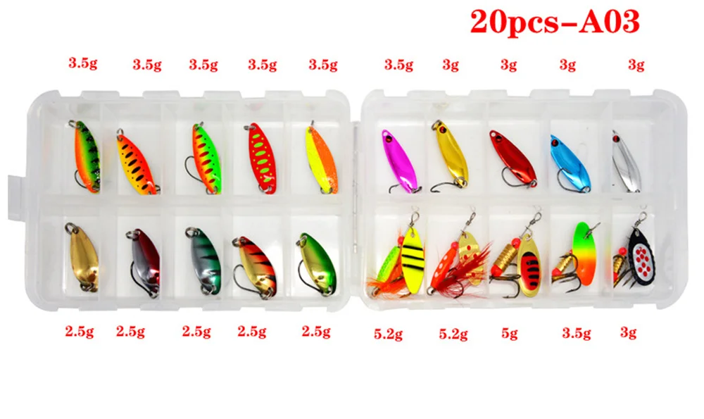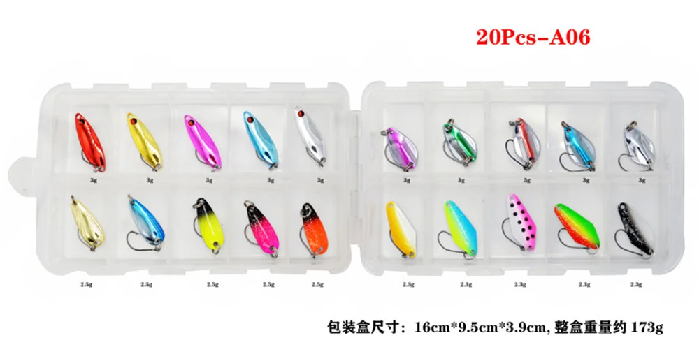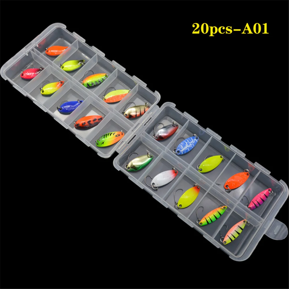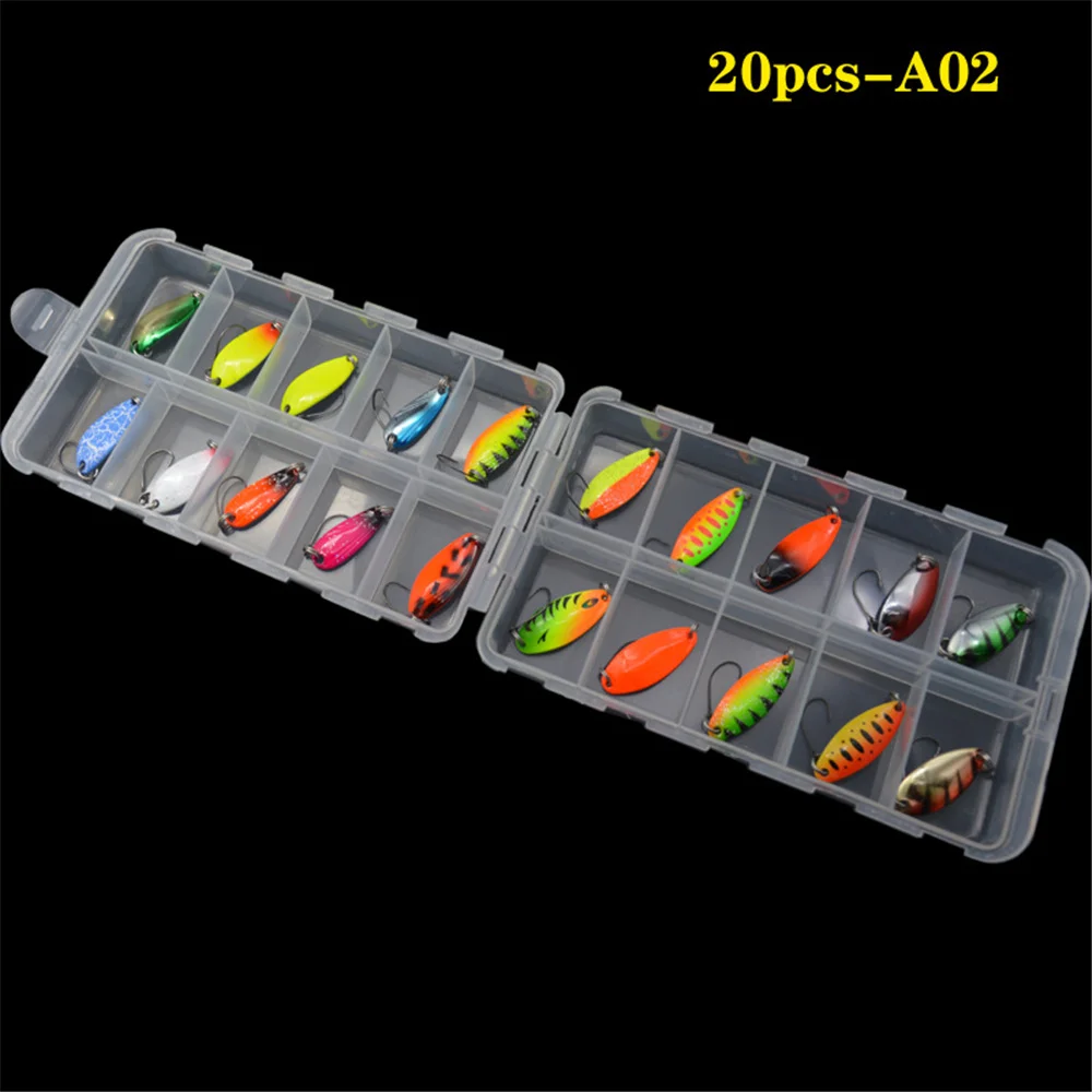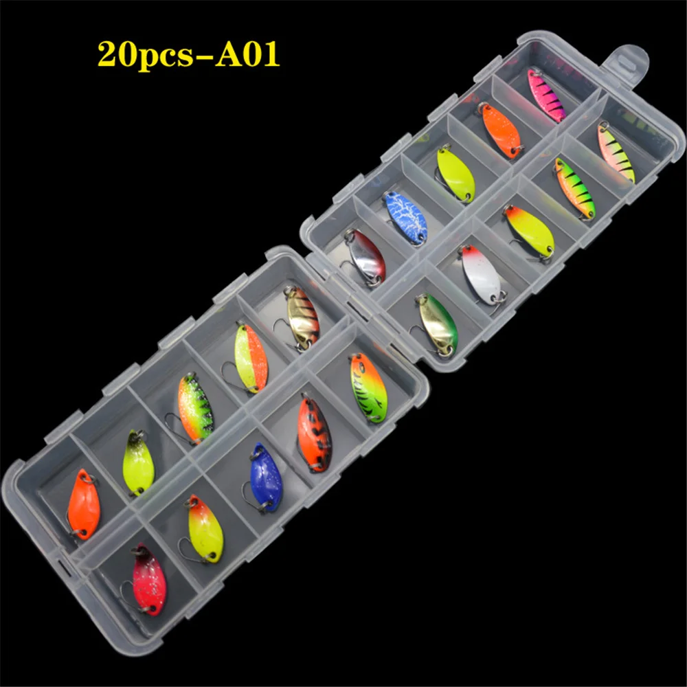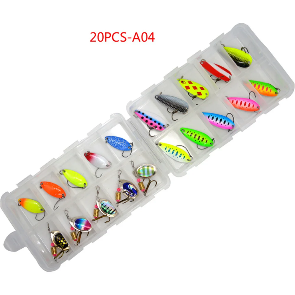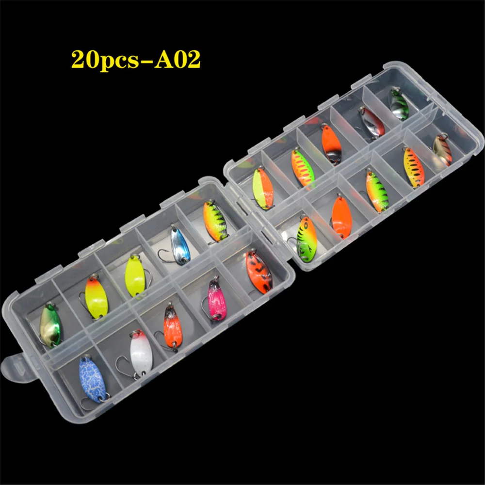 TWM20Pcs/Set de Señuelos de Pesca de colores mezclados, juego de cebo con cuchara, Kit de señuelos de Metal, Señuelos de Pesca con lentejuelas con caja, anzuelos triples, aparejos de pesca