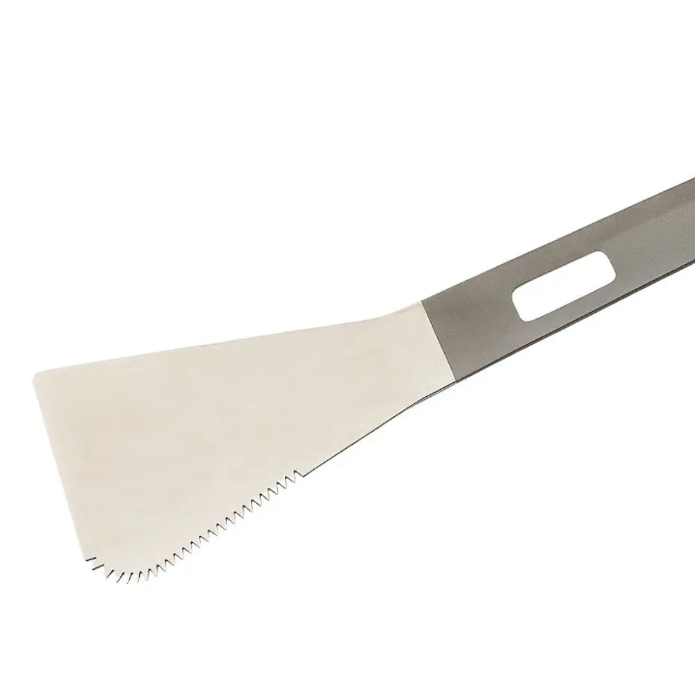 The spatula can be used to flip food; with serrated edge to cut meat or vegetables.