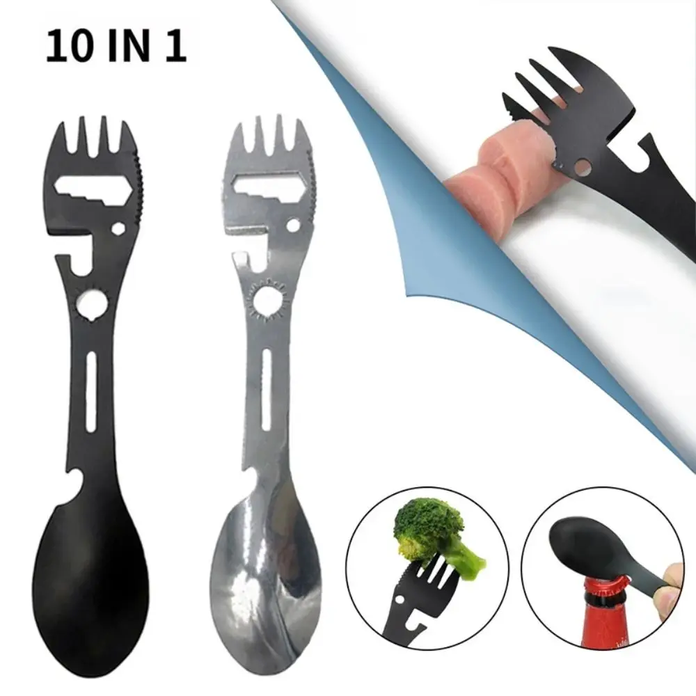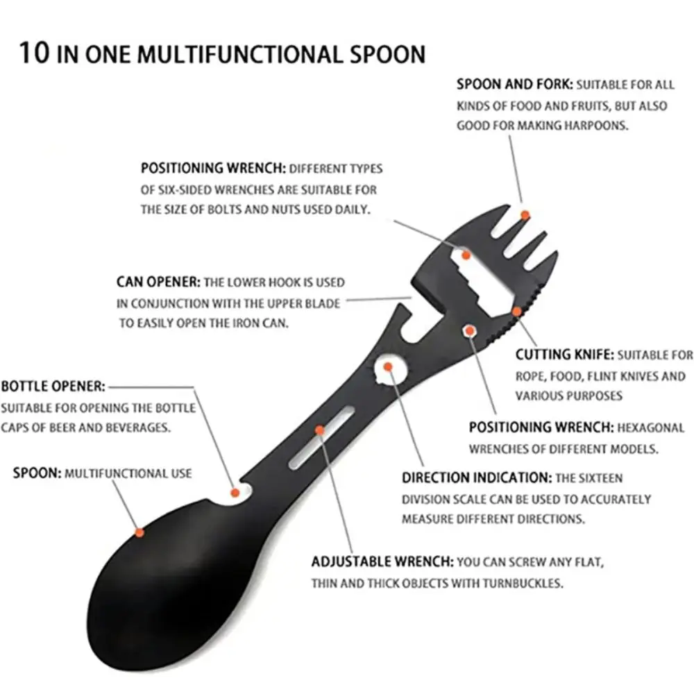 Nombre del producto: Tenedor de cuchara para acampar Color: negro, plateado Tamaño: 18cm * 3,5 cm Material: acero inoxidable Peso: 39g Función: cuchara, tenedor, abrelatas, abrebotellas, llave de posicionamiento, llave ajustable, indicador de dirección. Embalaje: 1 cuchara.