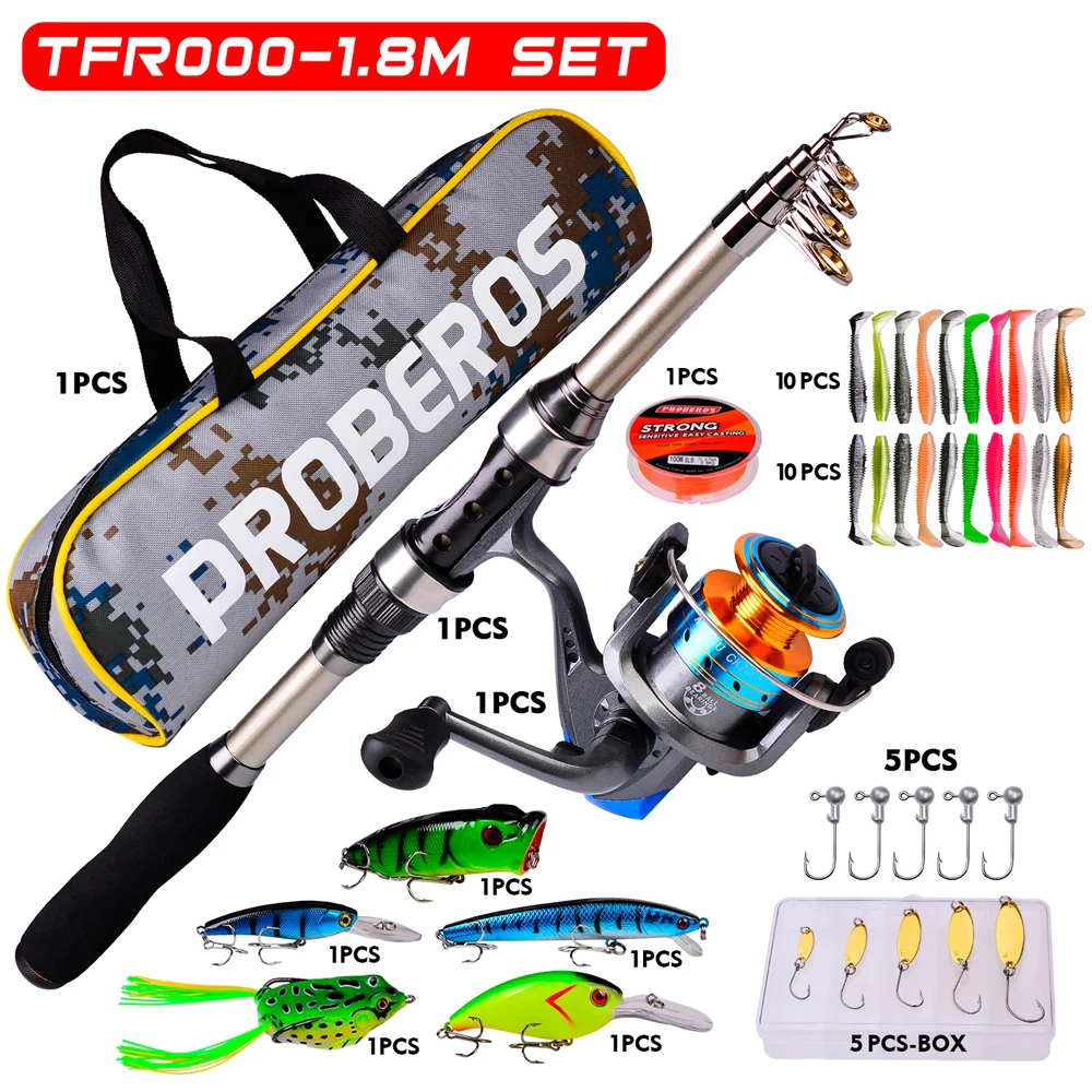Uso para niños de 1,8 m: 1 varilla de 1,8 m + 1 carrete giratorio ET200 + 1 línea de nailon de 100m y 8LB + 1 caja Spoonbaits + 5 anzuelos Jigging de 1g + cebos blandos de 60mm-1,8g de 20 piezas + 1PC 100mm-9g Minnow + 1PC 102mm-14,5g Minnow + 1PC 90mm-8,5G Minnow + 1PC 75mm-11g Popper + 1PC 60MM-13g Rana + 1 bolsa