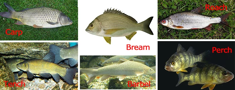 Carpa, percha, Barbel, Bream, Chub, Roach, Tencas, etc.