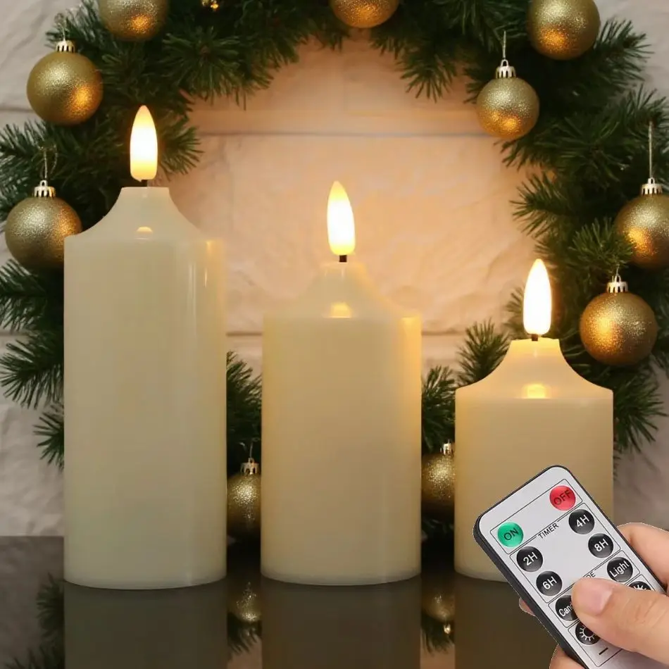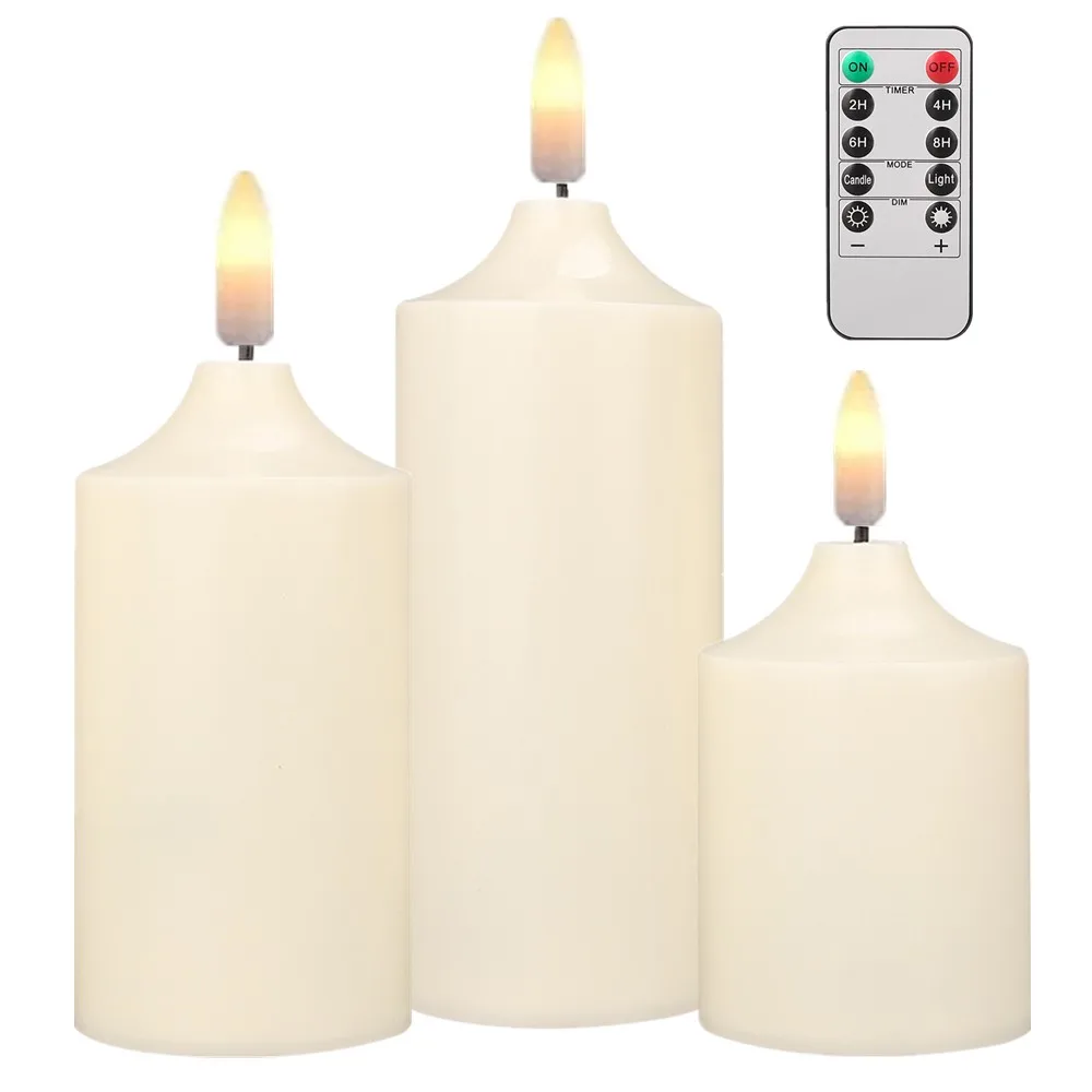 Todas nuestras velas con pilas AA parpadean en un juego de 3 tamaños: 148*56 mm/125*56 mm/100*56 mm.