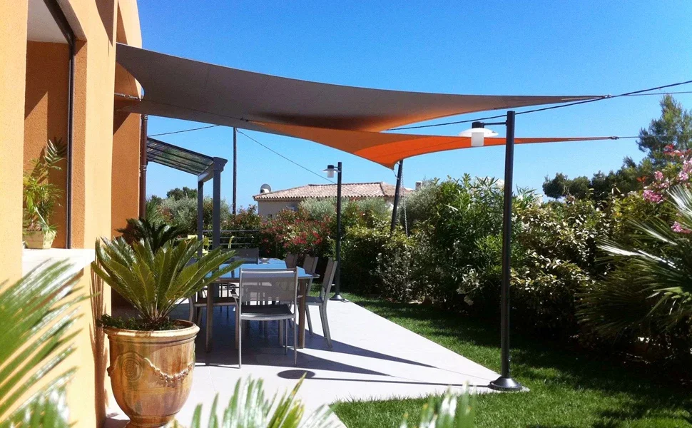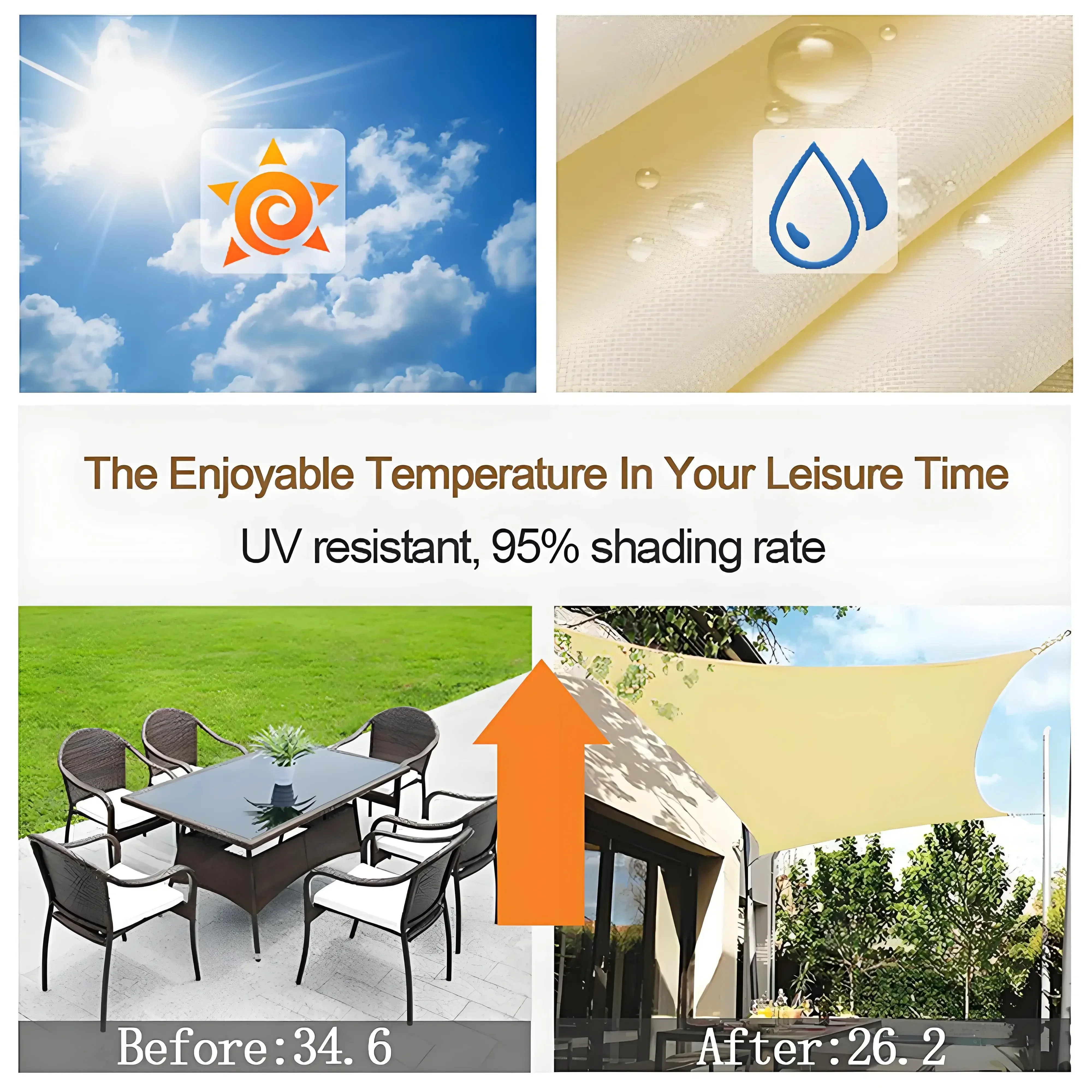 Resistente al agua: la tela ha sido tratada con un revestimiento impermeable, buena para la lluvia y el sol al mismo tiempo, es necesario inclinar la vela de sombra en una posición baja y alta para evitar que el agua contorneada durante la instalación.