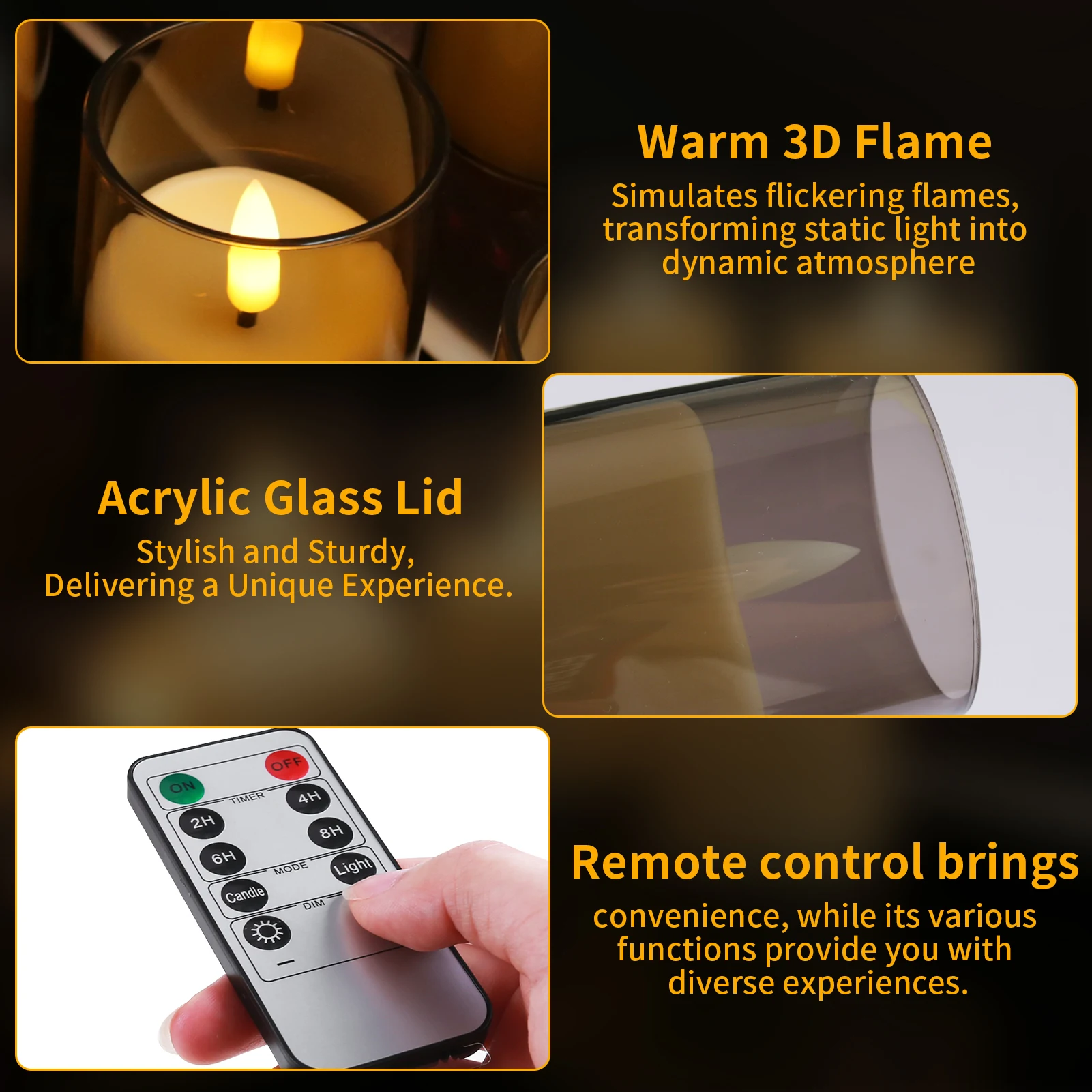 【ZWART 3D WICK】Realistische 3D-lont met behulp van een glazen kaarsomhulsel, geeft een realistische vlammencène om de echte kaarsen te imiteren.Maar ze zijn realistischer en mooier dan traditionele brandende kaarsen, voegen een romantische sfeer toe aan elke kamer of scène, geniet van je avond onder de gloed van de kaarsen.【AFSTANDSBEDIENING EN TIMER】: Met de afstandsbediening met 10 toetsen kunt u de helderheid verlagen of verhelderen.Flikkerend vlameffect en constante lichtmodus beschikbaar.Met de timerfunctie kunt u 2H 4H 6H 8H instellen, getimed om automatisch aan en uit te zetten en elke 24 uur te fietsen.【Gemakkelijk mee te nemen en niet kwetsbaar】Deze op batterijen werkende LED-theelichtkaarsen zijn gemaakt van een verbeterde acrylschaal die sterker en lichter is dan glas, zodat u zich geen zorgen hoeft te maken over breuk.Het kleine formaat van 1,9 x 3 inch is zeer eenvoudig te plaatsen en te monteren.【Veiligheids-LED-pijlerkaarsen】Met alle voordelen van traditionele kaarsen en geen van de negatieven!Geen druipende warme was, geen rook, verbrand nooit, maak je nooit zorgen dat je in slaap valt zonder de kaarsen uit te blazen, geen zorgen over brandongevallen, vriendelijk voor kinderen en huisdieren.【Breed toepasbare huisdecoraties】Deze kaarsen op batterijen zijn een ideale decoratie voor bruiloftstafeldecoraties, salontafels, boekenplanken, ramen en eettafels, en perfecte huisdecoratie voor wandkandelaars, lantaarns, open haarden, tafels of kandelaars.