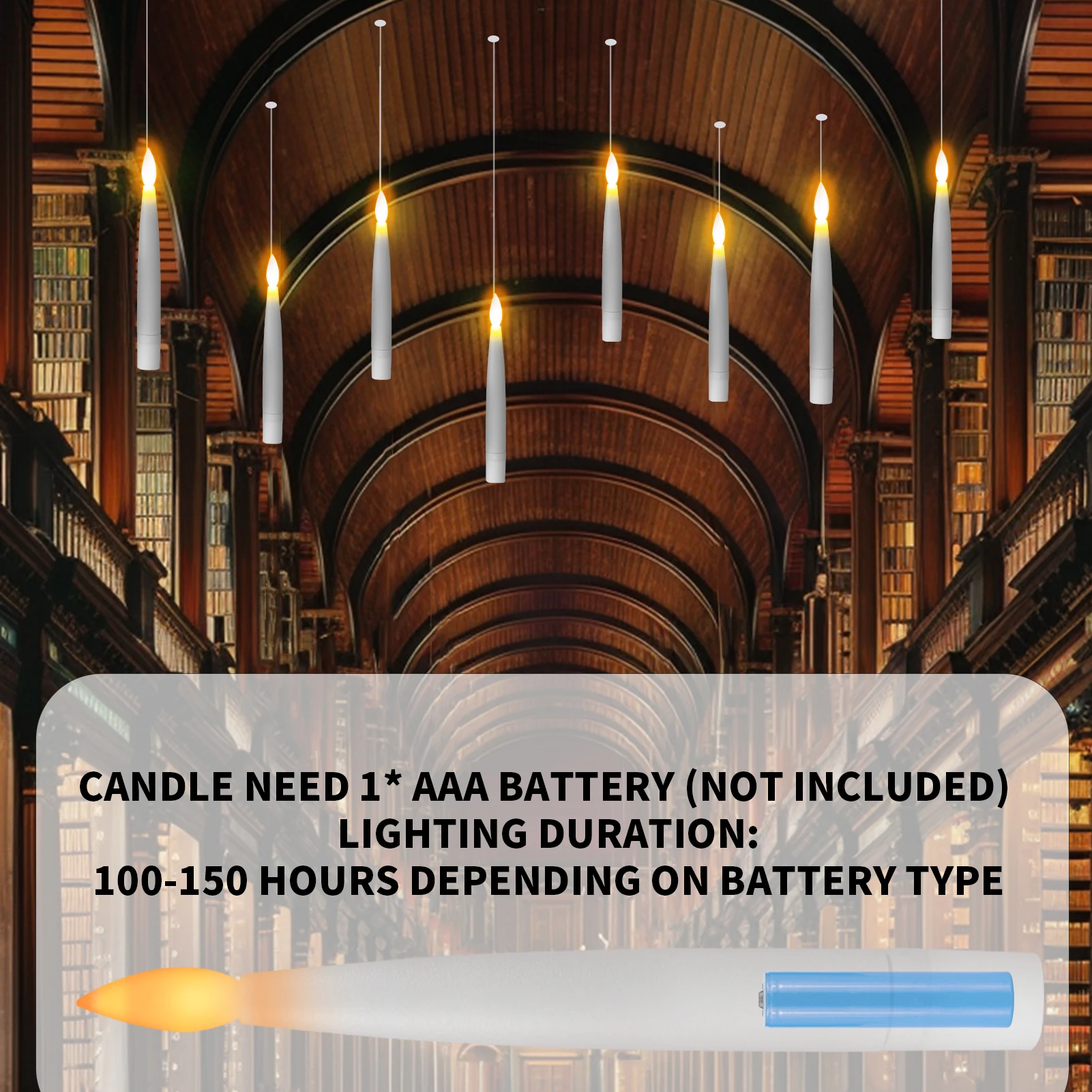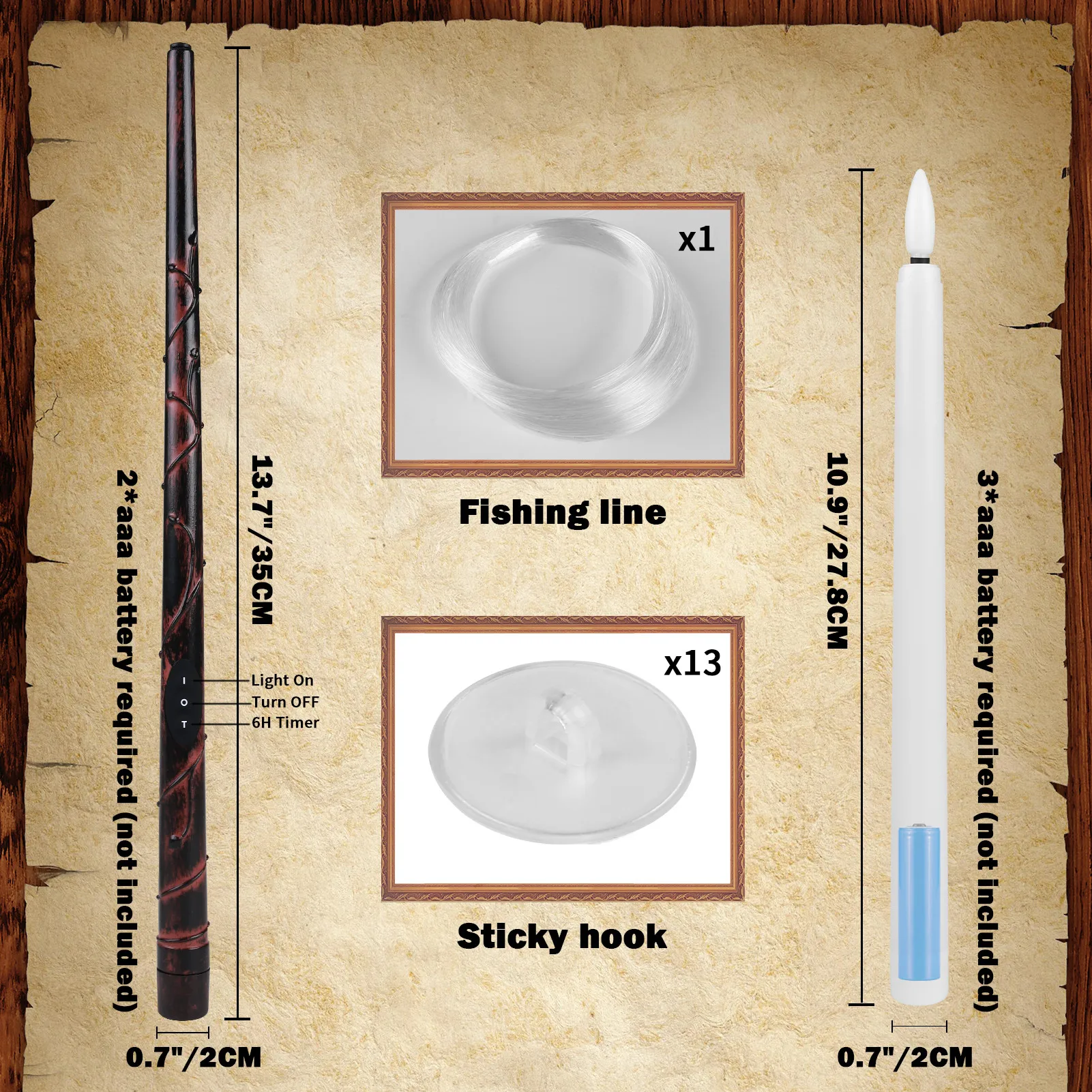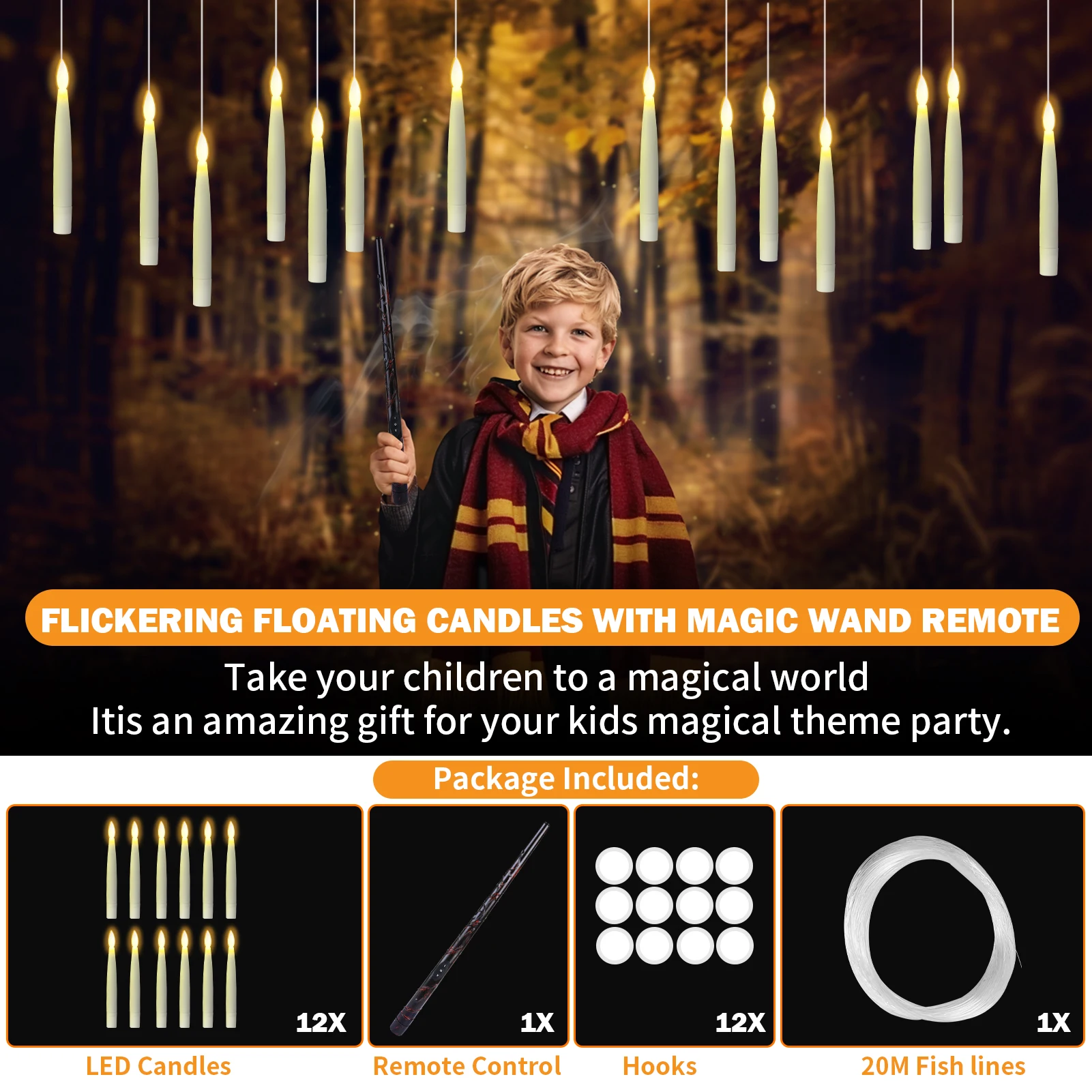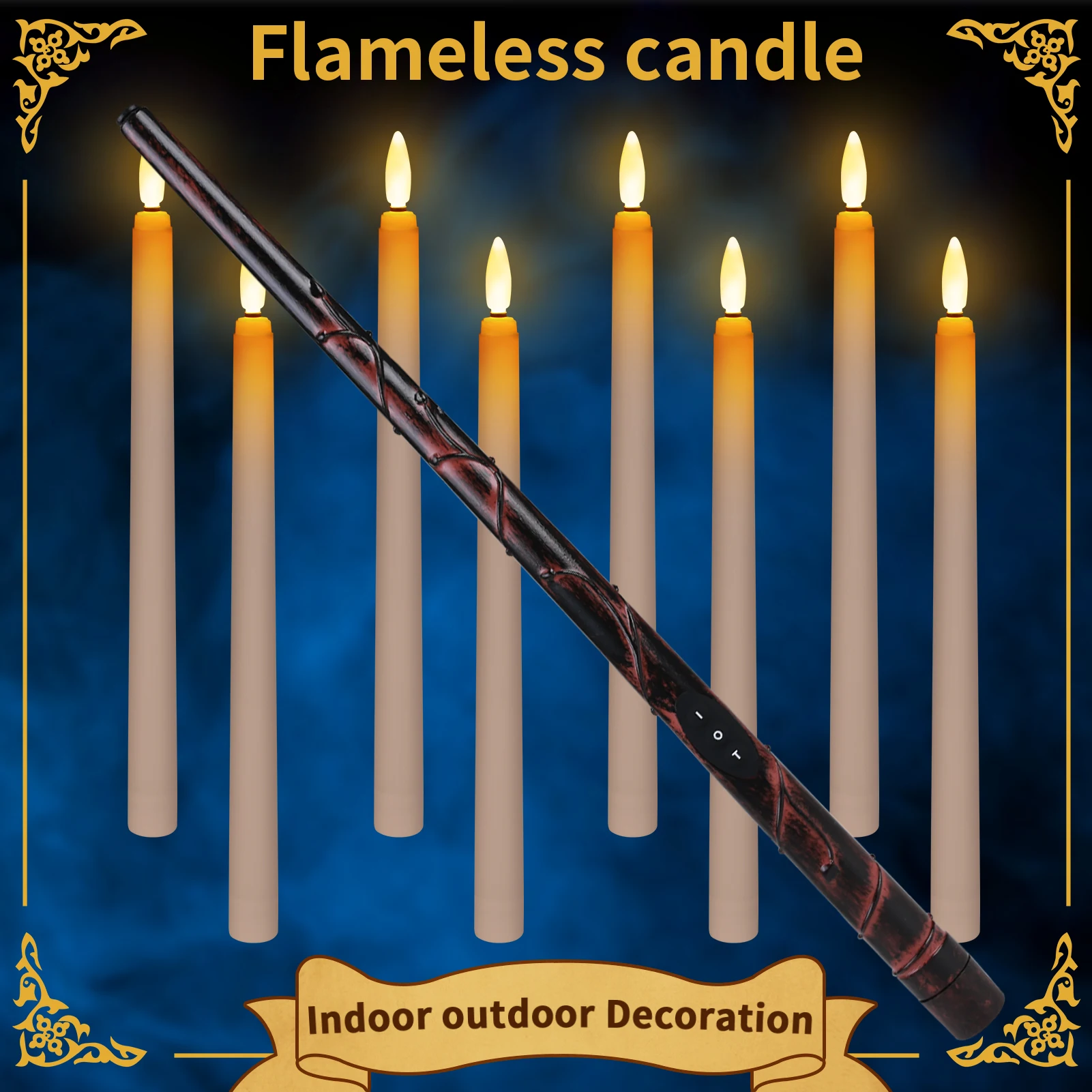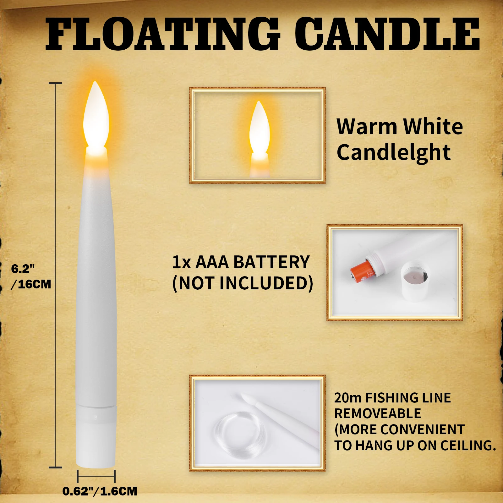 Juego completo: nuestro juego incluye 8/24 velas flotantes LED, cada una de 27,8 cm de altura y adornadas con un hilo de pescar de 200 cm.También viene con un control remoto de varita mágica.Cada vela flotante sin llama funciona con una sola batería AAA (no incluida)Control remoto de varita mágica: el control remoto de varita mágica, alimentado por batería AAA (no incluida), ofrece un interruptor y una función de temporizador de bucle de seis horas.Experimente la comodidad de controlar sus velas con solo tocar la varita, agregando un toque encantador a cualquier ocasión.Decoración versátil: el hilo de pescar de 200 cm viene con un juego de velas de 8 piezas que permite una fácil personalización y colocación en varios entornos.Puedes recortar la línea para adaptarla a tus necesidades de decoración creativas, lo que hace que estas velas sean perfectas para cualquier ocasión.Atmósfera mágica: cree un ambiente mágico para Halloween, Navidad y otras festividades con nuestras velas flotantes y nuestro control remoto de varita mágica.El suave brillo y las llamas parpadeantes realzan la atmósfera encantadora, haciendo que sus celebraciones sean verdaderamente memorables.Opción de regalo bien pensada: nuestras velas flotantes LED son un regalo práctico y atento para sus seres queridos durante la temporada de Halloween.Ofrecen una manera fácil de agregar un toque de magia navideña a cualquier hogar, convirtiéndolos en un regalo encantador para amigos y familiares.¡Bienvenido al Mundo Mágico!Velas flotantes, magia de la varita,Crea un país de los sueños, puro y gráfico.Las estrellas brillan, los sueños se encienden,La fantasía combina con la luz de la realidad.Especificación de velas flotantes sin llama:Color de las velas: blancoMaterial de la vela: PlásticoColor de la luz: blanco cálidoTamaño: 27,8 CMFunciona con pilas: 3 pilas AAA (no incluidas)Aplicaciones: boda, Navidad, Halloween, fiestas, iglesia, decoración del hogar, fiesta de cumpleaños, fiesta temática, festival, decoración navideña.Especificación remota de varita mágica:Puede encender y apagar fácilmente la luz de las velas y también tiene una función de temporizador de 6 horas.Longitud: 13,7"Alimentación: 1 × batería AAA (no incluida)Funciones: Temporizador ON/OFF/6HMaterial: ABS