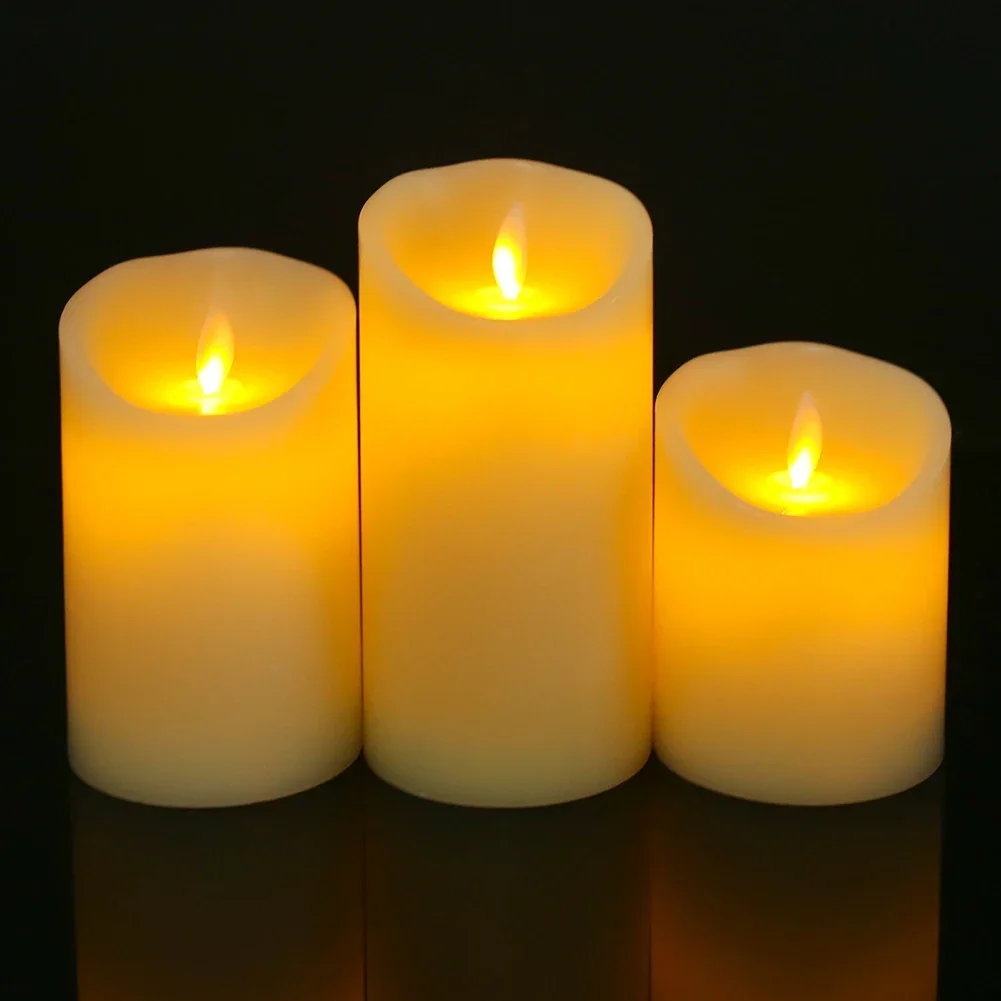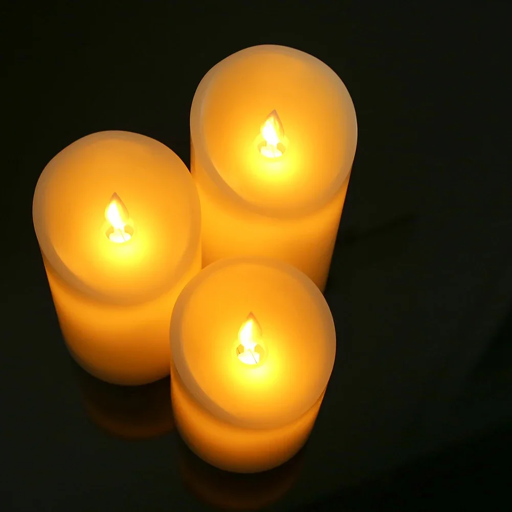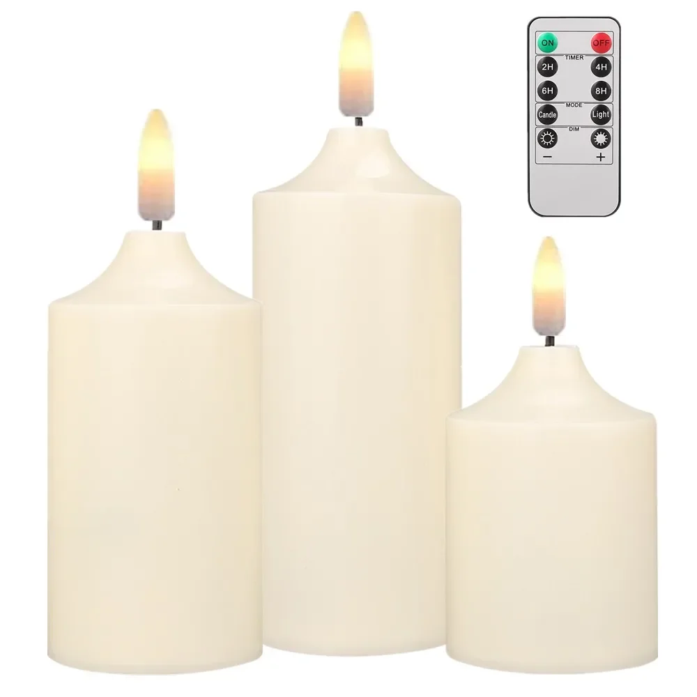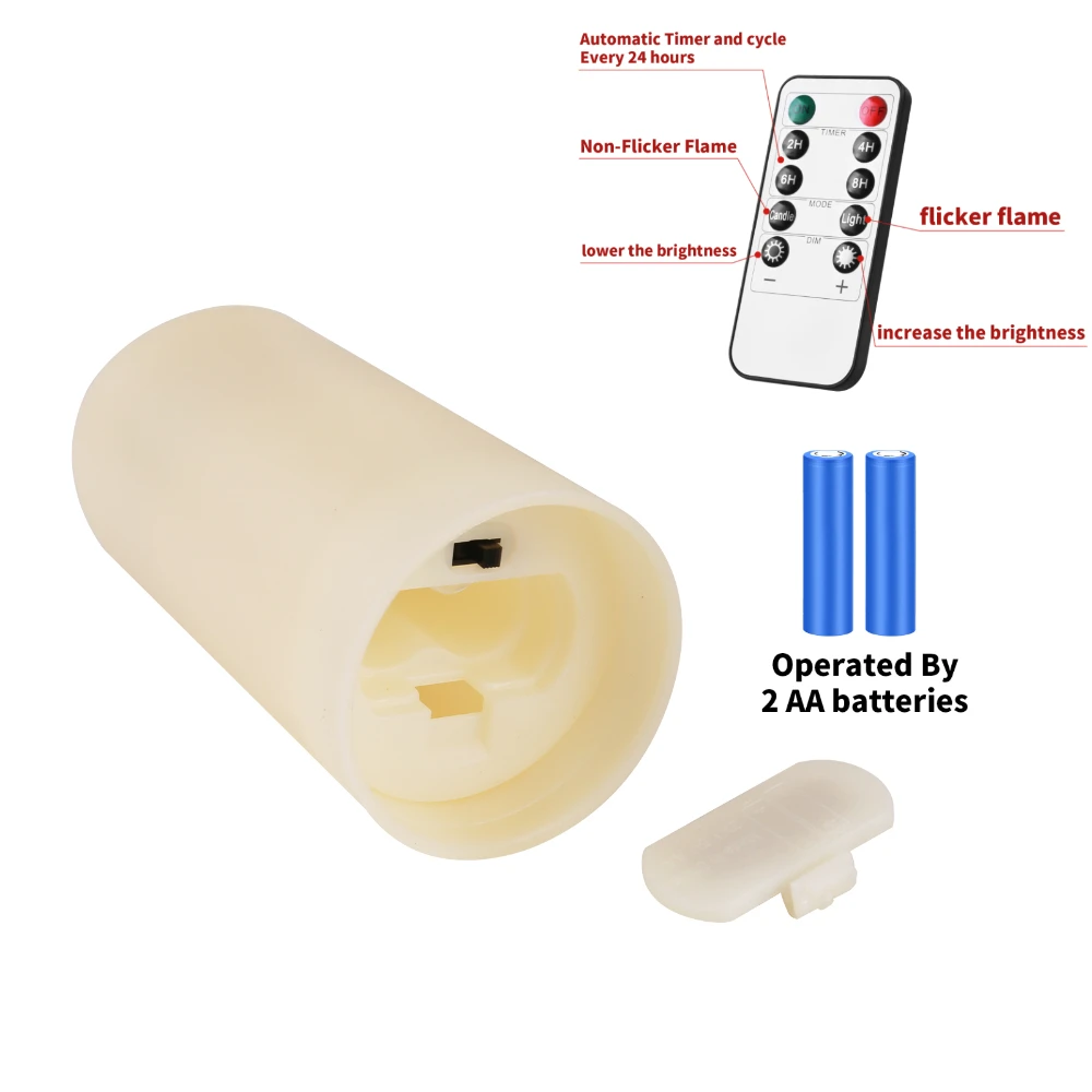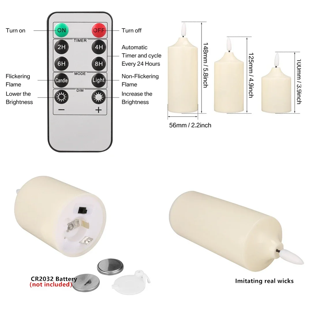 Este paquete económico incluye 3 pilares de 4,1", 3 pilares de 4,9", 3 pilares de 5,8", 3 velas de 6,8 " (cada diámetro de 2,2", control remoto x 2.Manual x1.Esta vela sin llama funciona con 2 pilas AA (no incluidas)