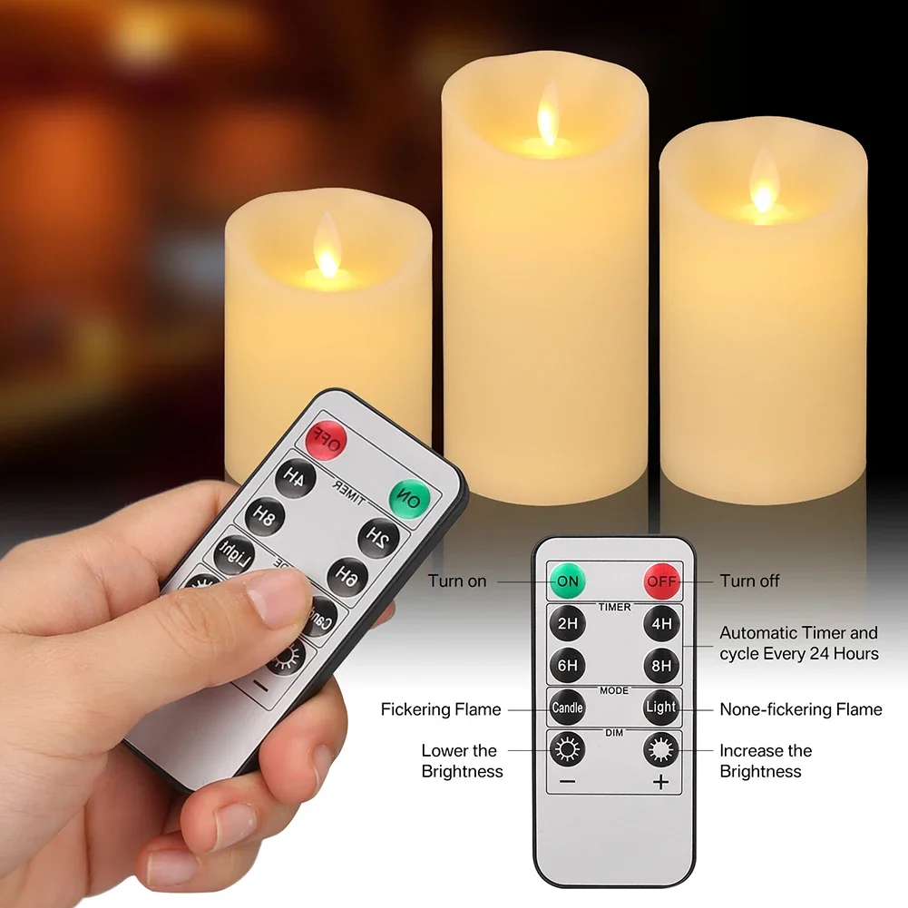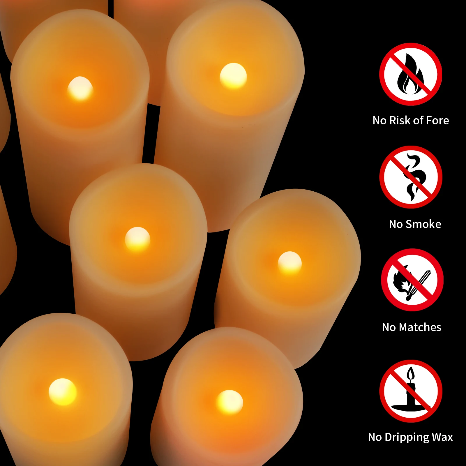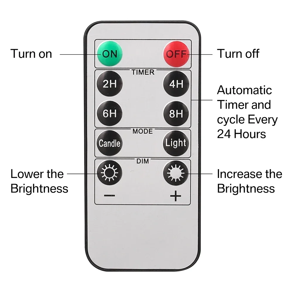 【Comodidad del control remoto】: Dígale adiós a la molestia de encender y apagar individualmente cada vela con batería.Este producto incluye un práctico control remoto que le permite ajustar los niveles de brillo, elegir entre parpadeo o luz fija y configurar un temporizador para el apagado automático.Con solo presionar un botón, puedes controlar sin esfuerzo el ambiente que se adapte a tu estado de ánimo.