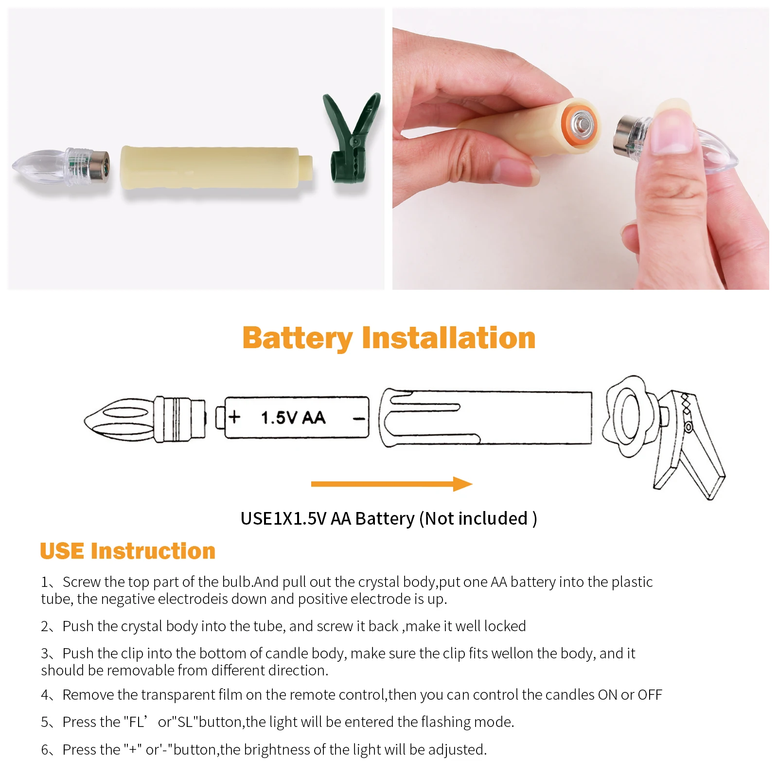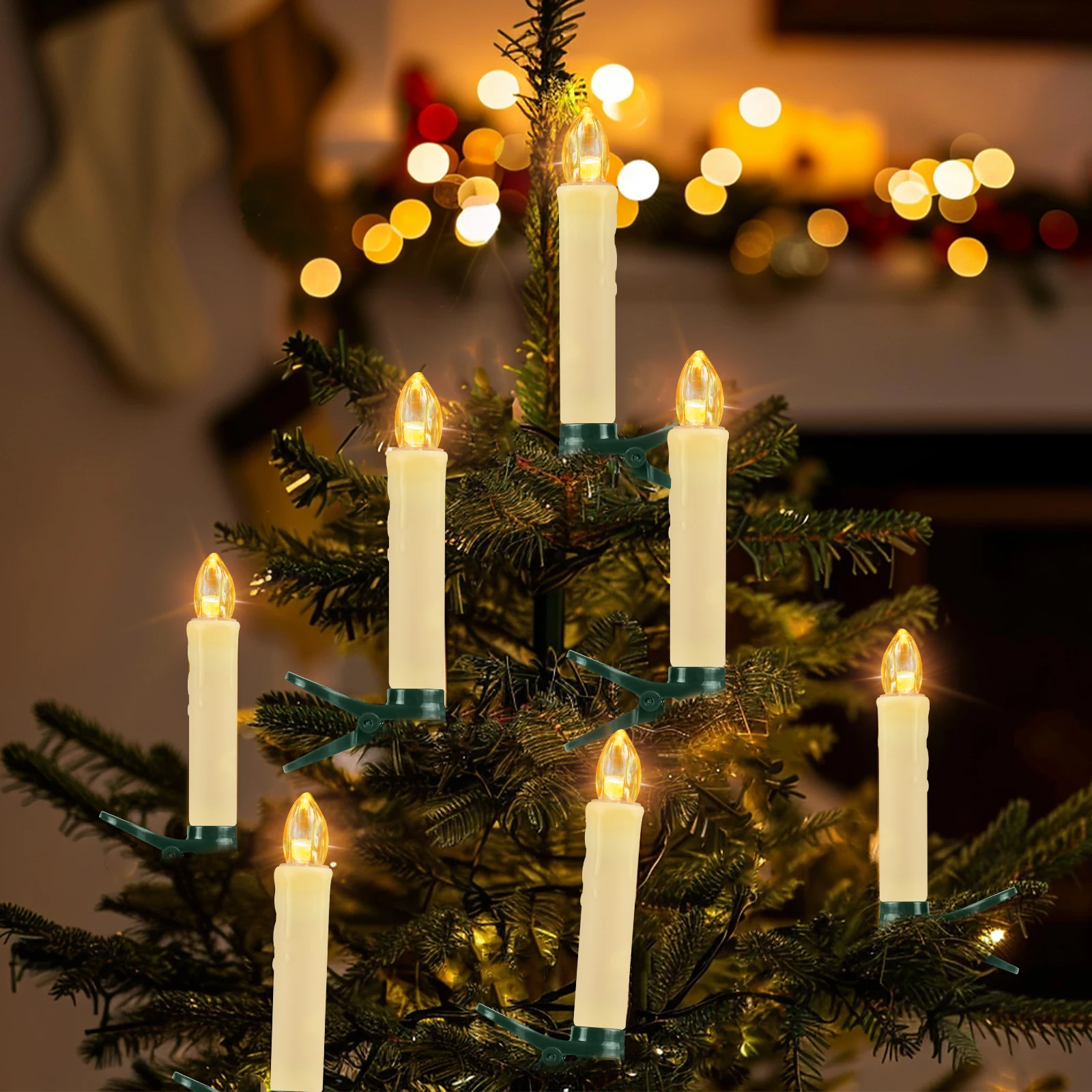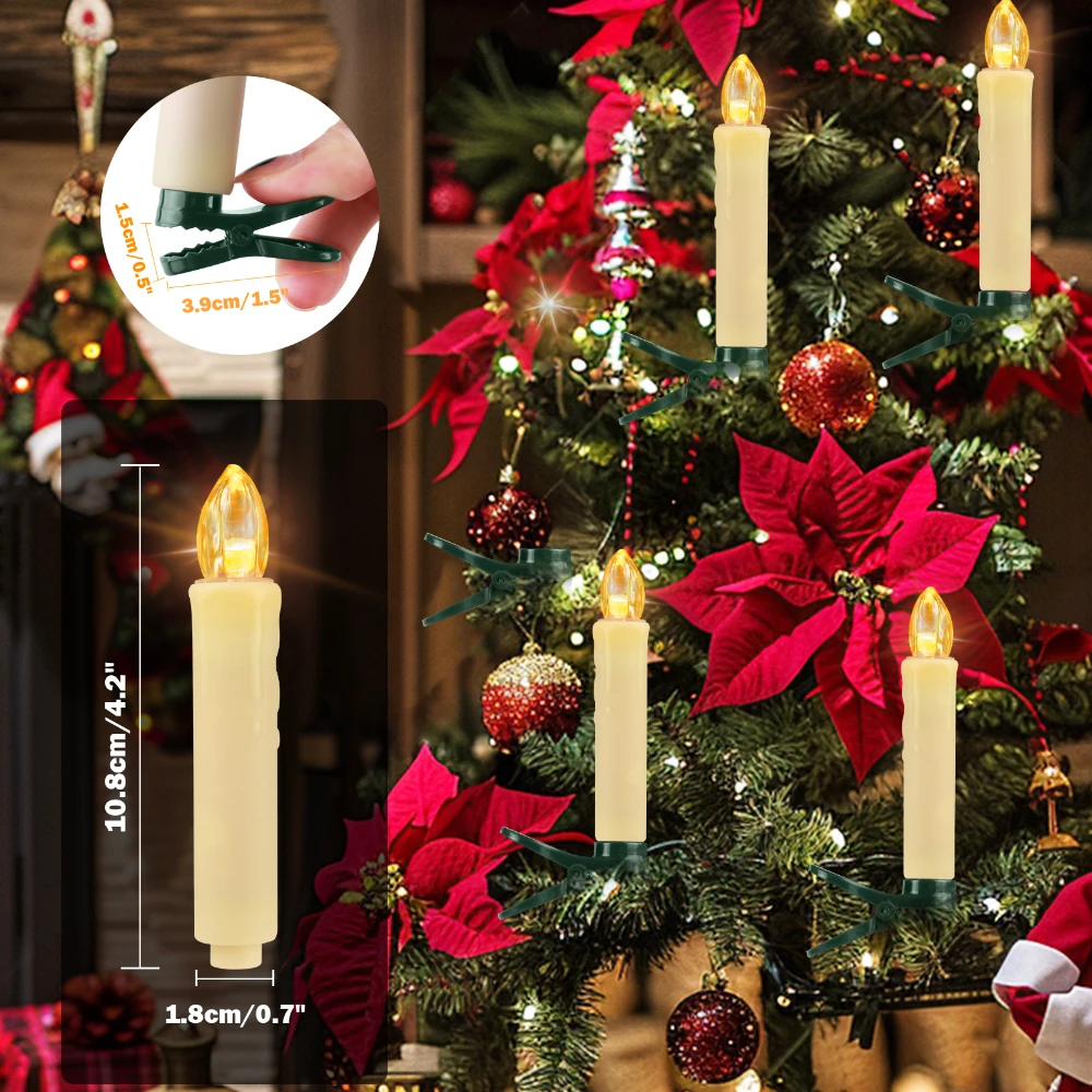 POTENCIADOR DEL ÁRBOL DE NAVIDAD:Adorna tu árbol de Navidad con nuestro juego de 10/20/30/40 LED velas, cada una con un diseño de cera de goteo realista con un clip fácil de colocar. Cada uno de 1,5 ''de diámetro y 4,7'' de altura (5 "con clip), alimentado por 1 Batería AA de 1,5 VNo incluido... Estas velas sin llama se doblan como adornos encantadores, proporcionando un brillo cálido y parpadeante que resalta las decoraciones circundantes y se suma al encanto general y la visibilidad del árbol de forma segura
