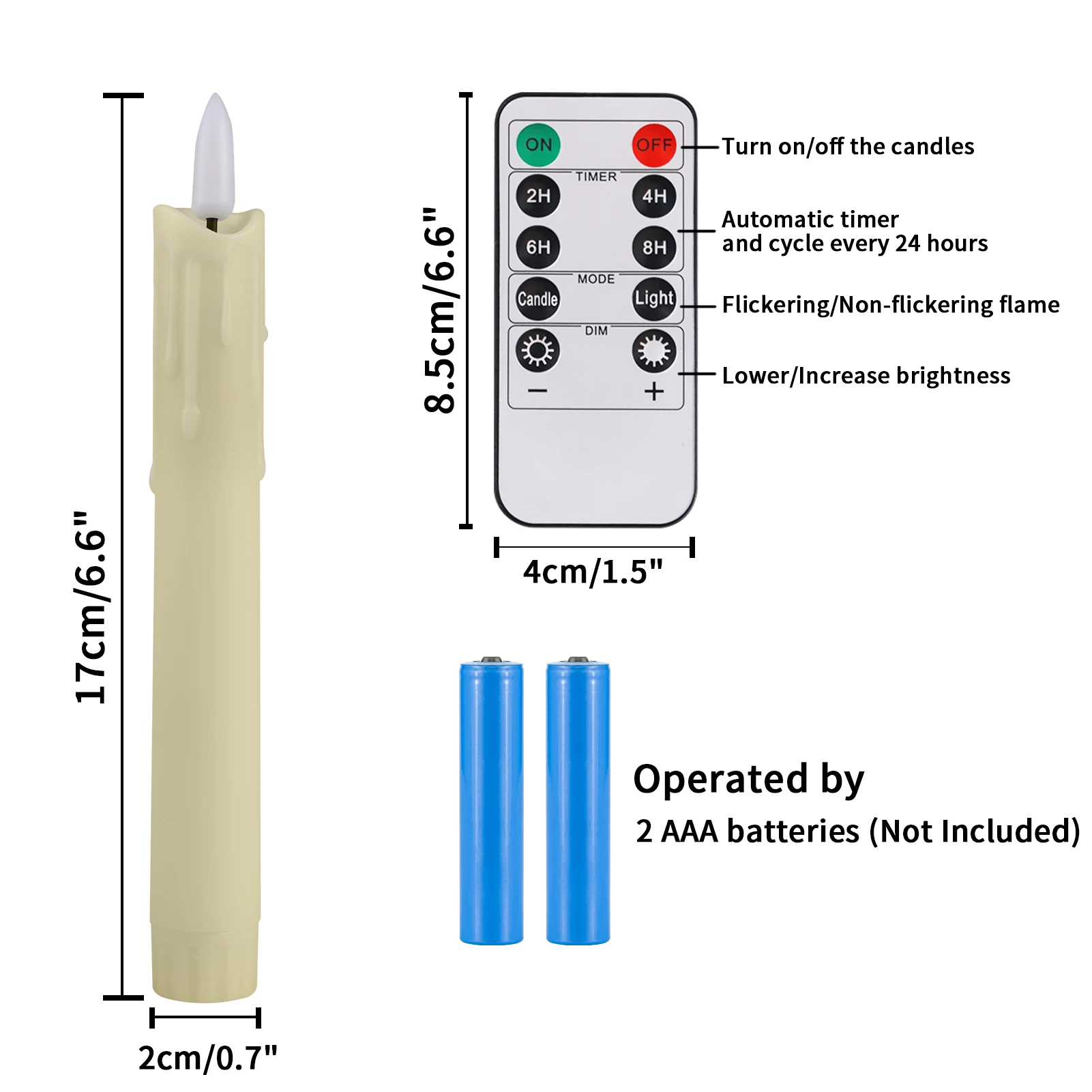 Paquete y servicio:Cada paquete contiene 6 * velas con controles remotos inferiores y 1*10 teclas. Cada vela cónica de batería se prueba a fondo y rigurosamente antes de la venta, evite su uso en entornos de alta temperatura. Si hay algún problema durante el uso, póngase en contacto con nuestro equipo de atención al cliente y el problema se resolverá lo antes posible.