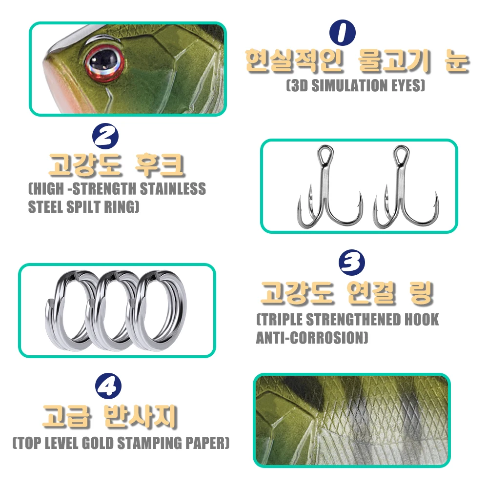 3.The baits have lifelike painting and vivid 3D eyes ,they make the bait looks like real fish swimming in the water during fishing.
