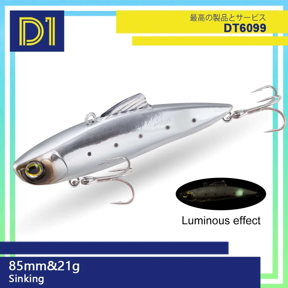 D1 Vibes para pesca de invierno 85mm 21g Efecto UV Color blanco plateado Fundición larga Hundimiento Todo el agua Señuelo Vib Japón para Lucio Percha